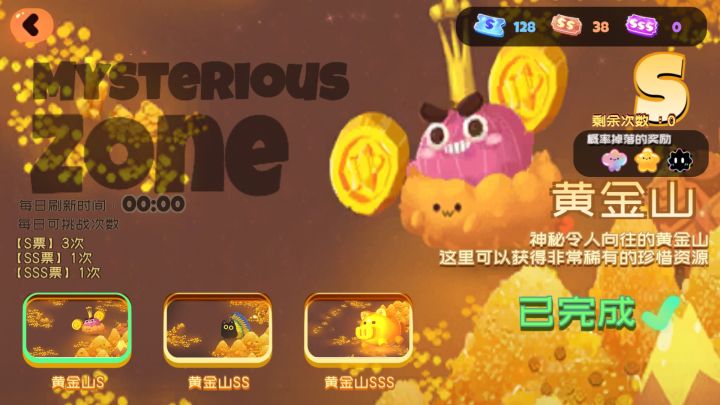 黄金山,中后期果冻币两大来源之一,另一个来源是bug补偿()入场券分为S,SS,SSSS票和SS票在主线BOSS关和番外副本会掉落,SSS票依靠签到和果冻池抽取获得。S票和SS票有就能用,实现扫荡卷自由后这两个是溢出的,SSS票得组出一个合格的黄金山队伍再去打,这样性价比高。下图为黄金山养老阶段正常收获(图源群友)三档黄金山及格线分别为500,1000,1800(SSS档参考数值太少,不