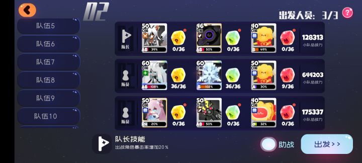 只适合天赋树和家园属性较高的大佬!剩余七分钟结束战斗下面是队伍搭配主输出三叉姬(全技强)朵朵回血加伤(全技强)猫猫破甲(全cd)赛亚鸡加暴击(暴击%75加自带的15%剩下叠暴伤)打call煤球回血并增加血量上限(血糖)炸鸡块加伤害(血糖)武器拿强势的就差不多了(暴击糖天赋树和赛亚鸡的15%暴加起来90%剩下叠爆伤)三叉姬技能伤害高但范围小,尽量等怪聚集了再放技能,技能cd中就围着