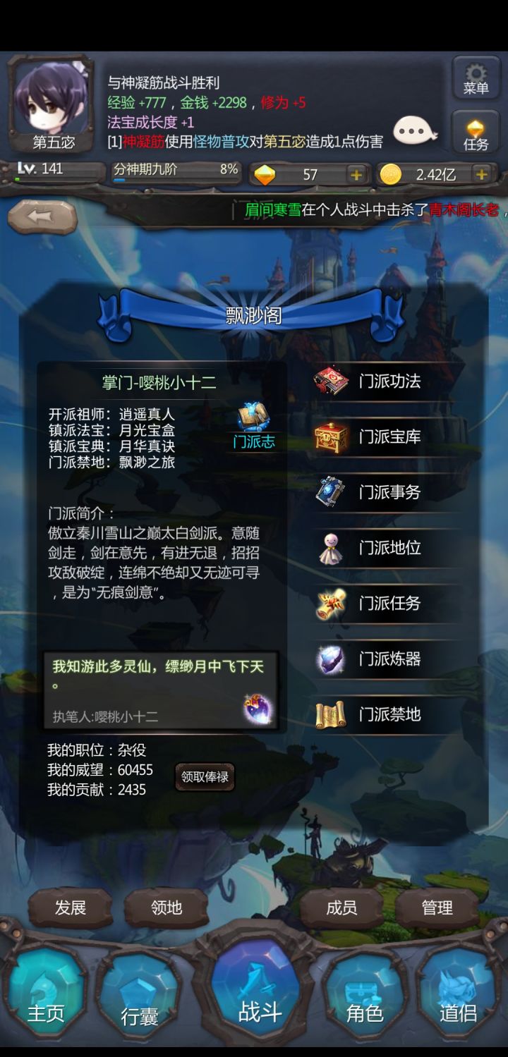 1.本来有几千零食,莫名其妙变成几十了2.门派职位变成杂役了
