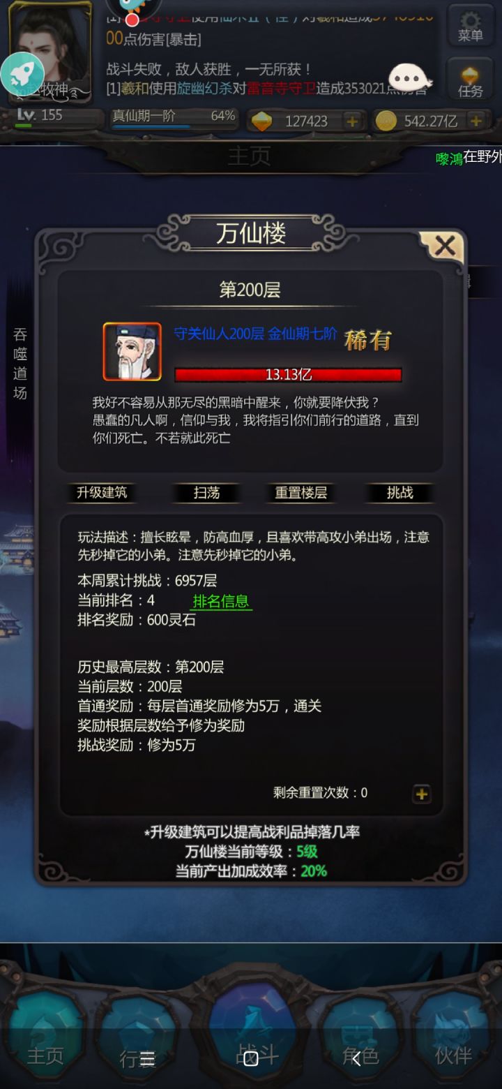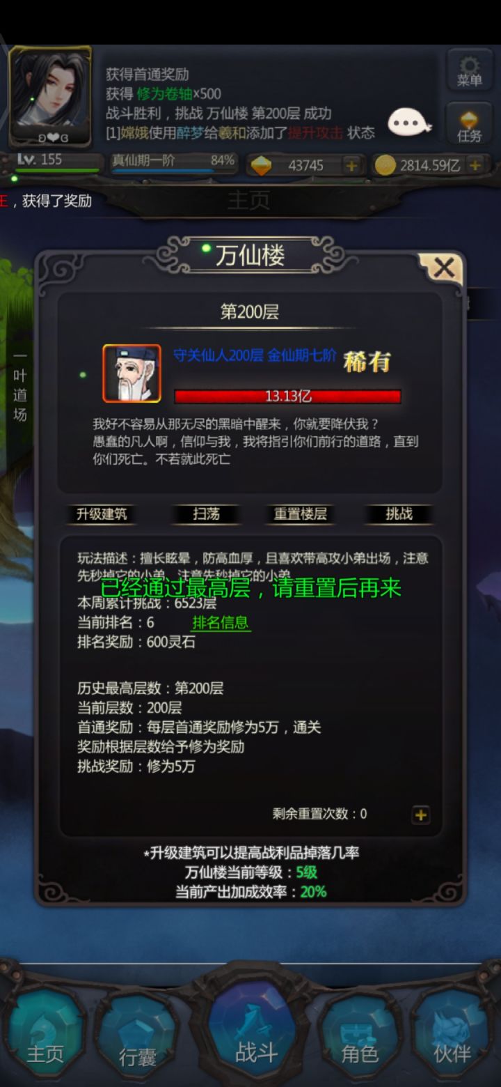 万仙终于毕业了,在论坛偶然看到一位大佬的攻略,在遗迹群里咨询后,发现要带枯荣才控得住,自己手动刷了20分钟😏,终于通关了