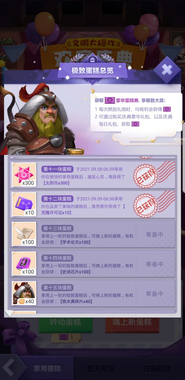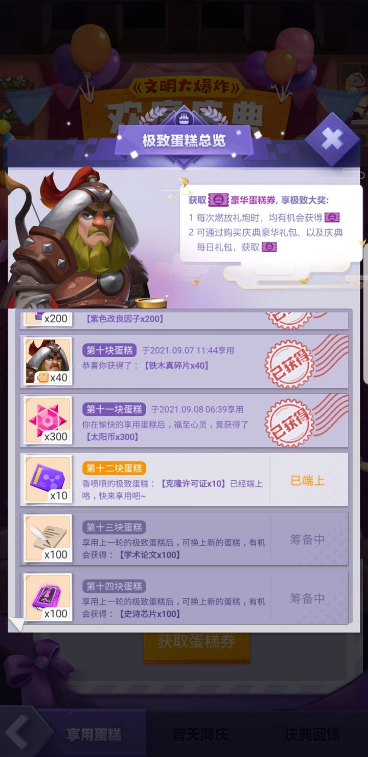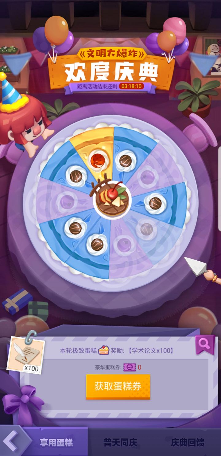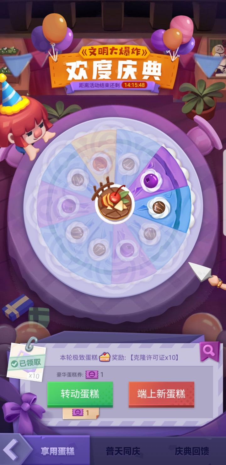 十二块了,没有花钱,还有一张券,今天预计还可以有二十个炮,大概还会有五张券,所以我有个天人的想法,下面两个金色都是垃圾,我这个蛋糕吃满再去十三签个到,这次活动圆满结束
