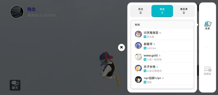 1. 我的角色ID:63809992. 问题描述:粉丝列表显示有5位粉丝且已互关,但我的“关注”列表始终显示为0。该问题从游戏创建角色时就存在,至今未解决。3. 已尝试操作:已多次重启游戏、切换网络、清除游戏缓存、清除全部游戏数据,均无效。4. 诉求:请帮忙在后台修复我的账号关注关系数据,让关注列表正常显示互关好友