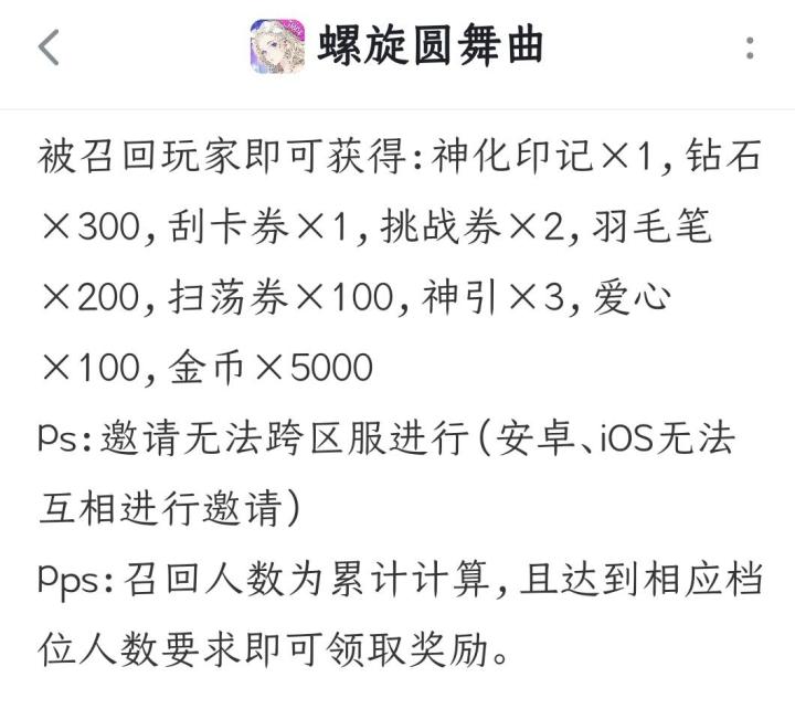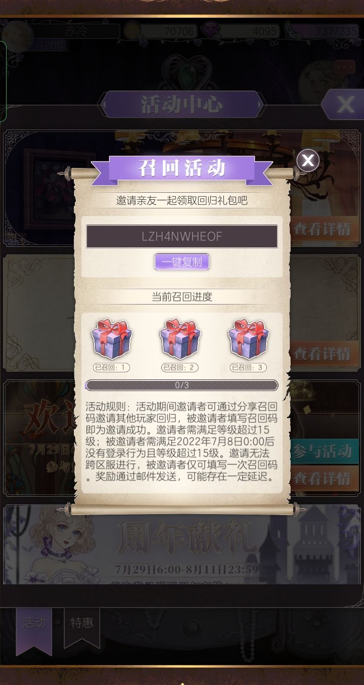 我是V6老玩家,提前蹲安卓回归姐妹,可加好友。要求15级以上,超过一个月没登陆,等到7月29日登陆填我的召回码,可拿以下奖励(一定要到7.29号填召回码登陆才能拿到哦)