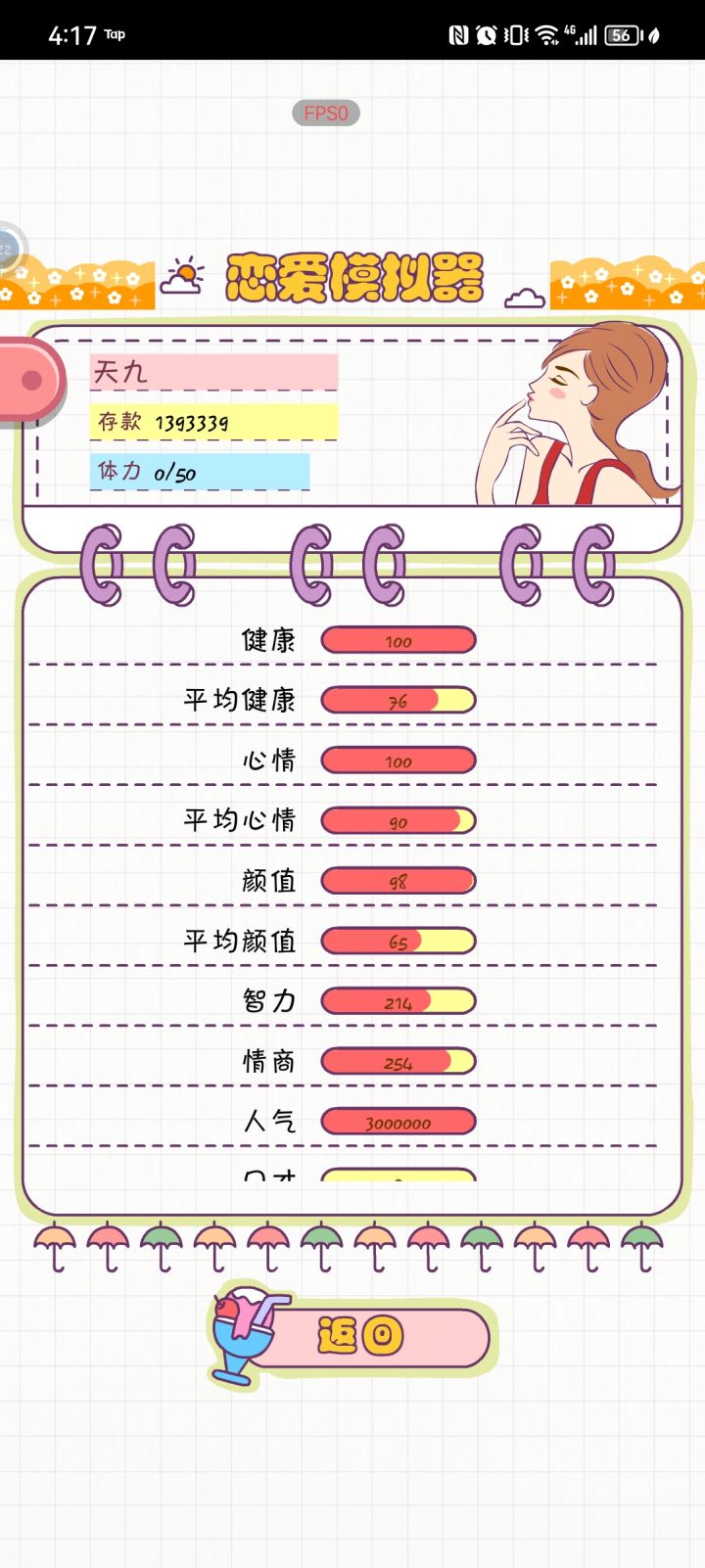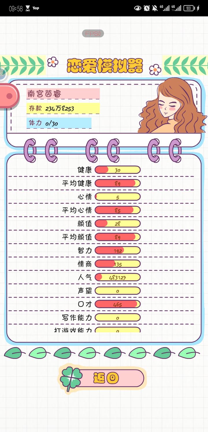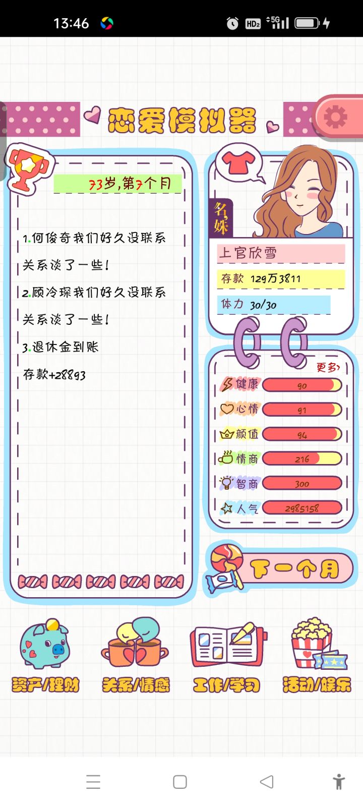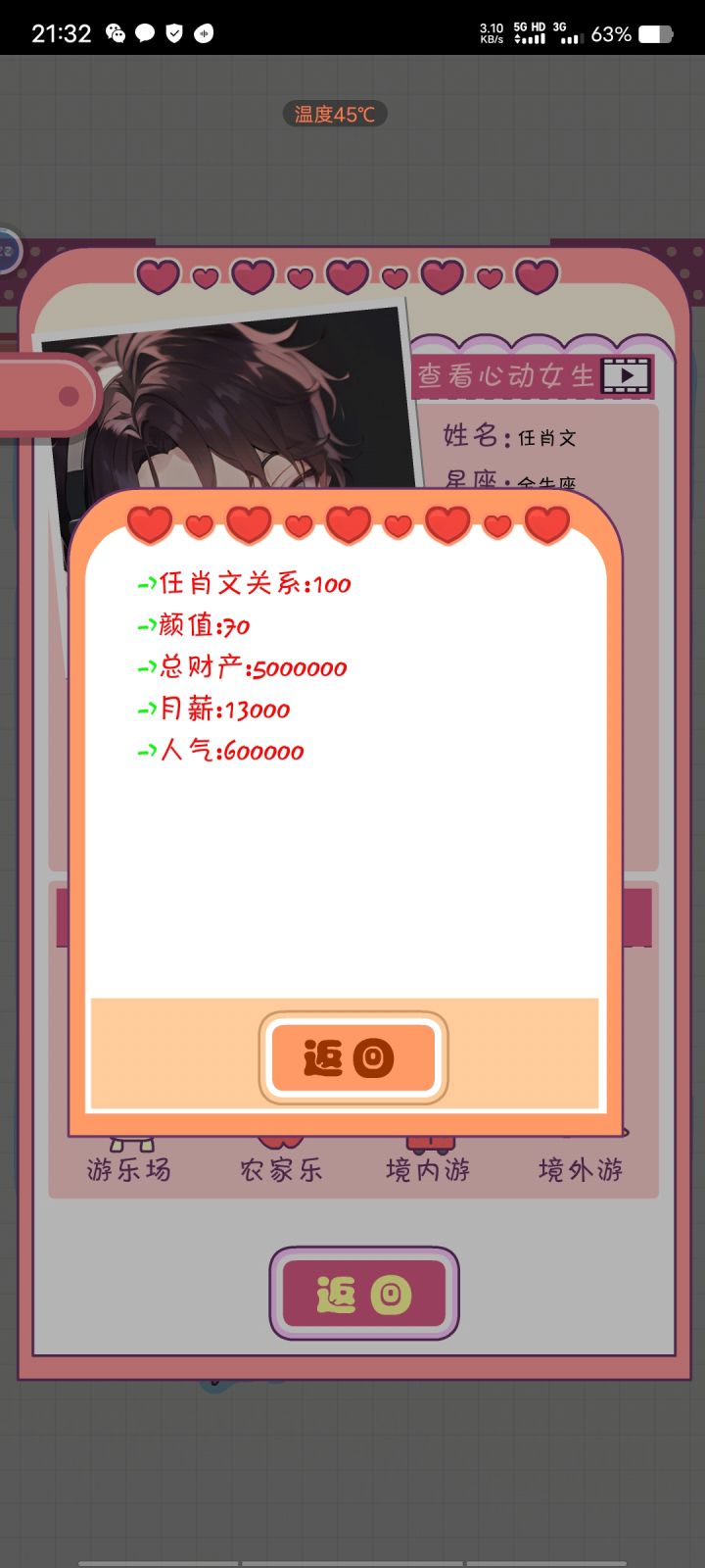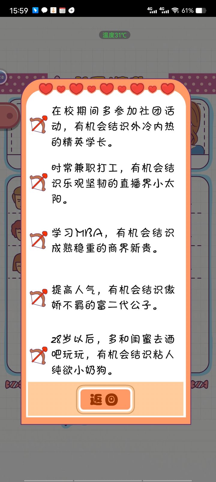 一、废话想不出起什么标题,以及可能是施工中,但不确定还会不会更新,即使没更新也写的差不多了二、情感关系所有人不互动过半年-6点关系,好友约会每10点关系+1点心情(有时候多1点),异性好友聊天+1关系,异性好友50关系以上有概率收到礼物,异性好友100关系符合条件有概率被求婚,结婚后关系0可以离婚,约会可能加情商1、父亲要零花钱:存款+500(受关系影响)2、母亲要零花钱:存款+50