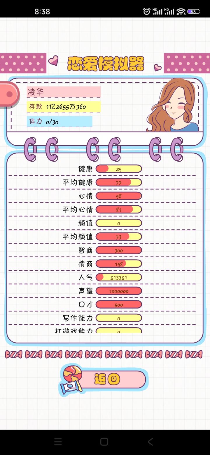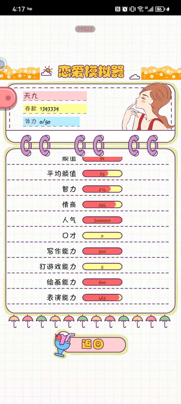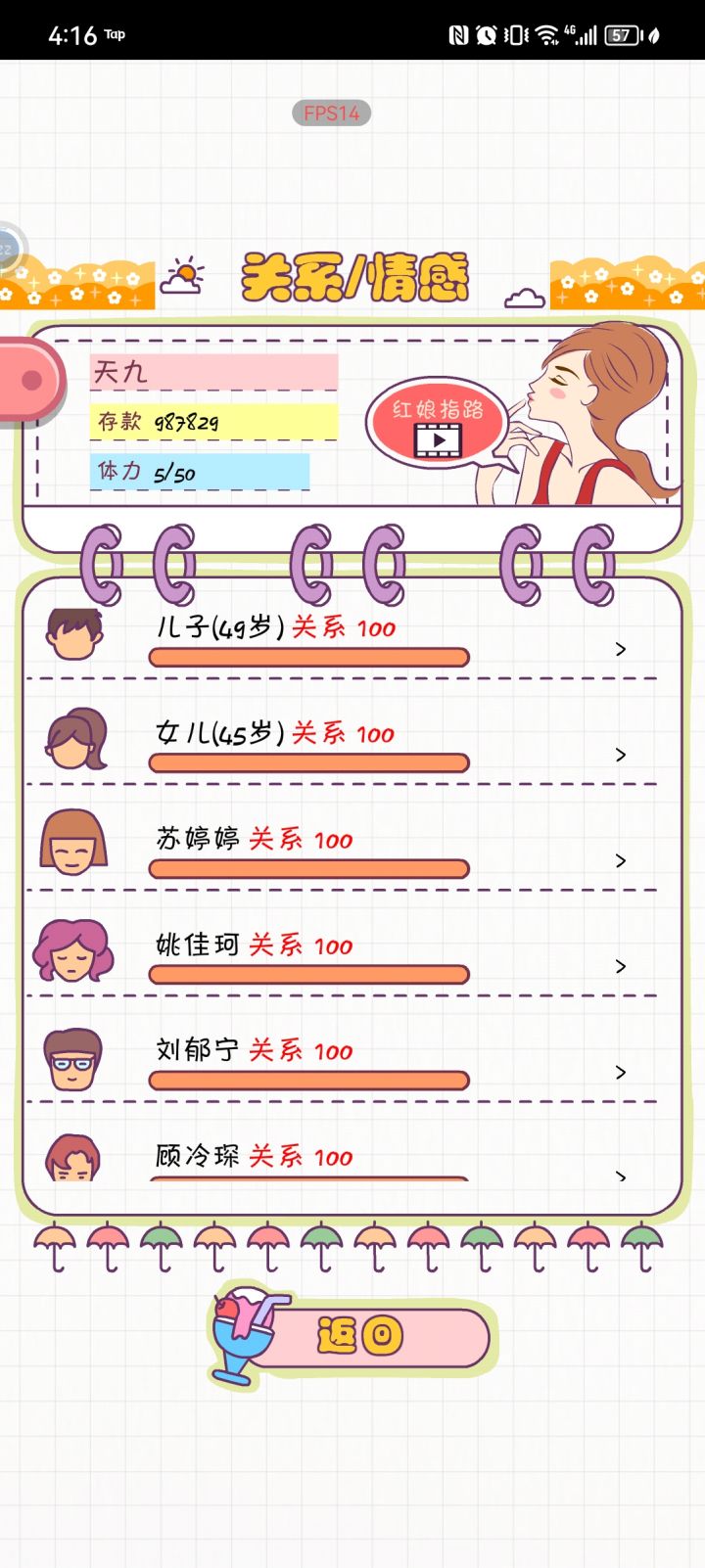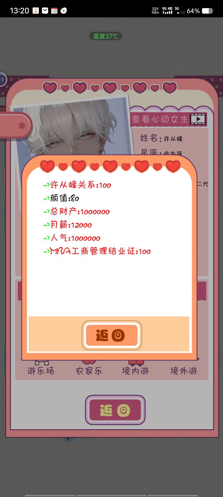 一、废话想不出起什么标题,以及可能是施工中,但不确定还会不会更新,即使没更新也写的差不多了二、情感关系所有人不互动过半年-6点关系,好友约会每10点关系+1点心情(有时候多1点),异性好友聊天+1关系,异性好友50关系以上有概率收到礼物,异性好友100关系符合条件有概率被求婚,结婚后关系0可以离婚,约会可能加情商1、父亲要零花钱:存款+500(受关系影响)2、母亲要零花钱:存款+50