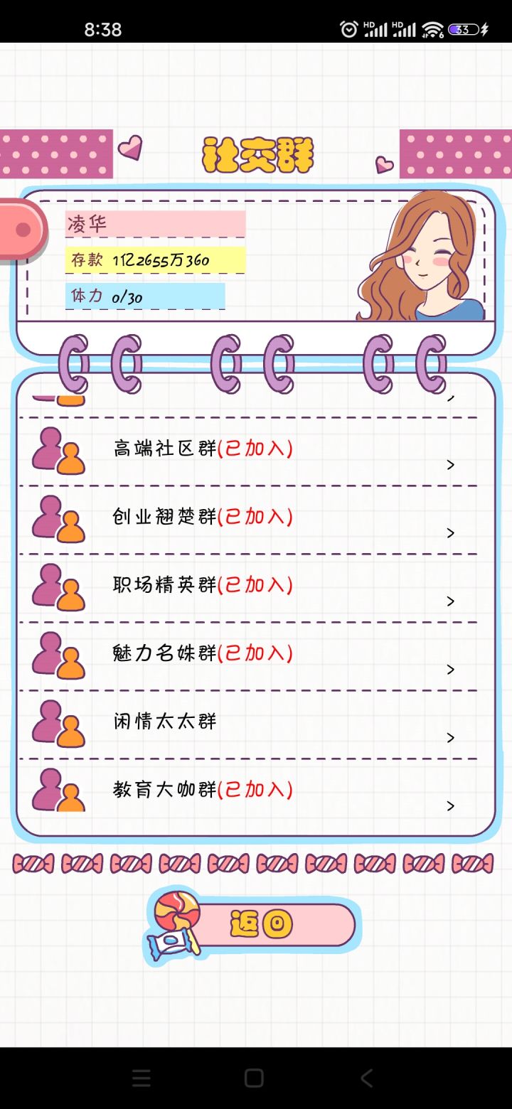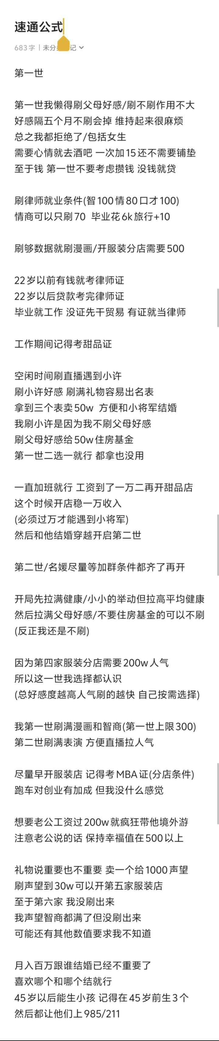 前期靠舔父母攒钱培训,刷口才、智力、情商等属性,中期靠舔老公(大十岁那个)攒钱,舔蓝颜攒礼物。等律师工作薪水八万,三个孩子也挺大负担得起每年75*3=225的培养费用后,开名姝模式,用攒下来的礼物换声望(我攒了三百多个礼物换了三十几万的声望)。再去聊天群把能加的群都加了(先职场精英后创业翘楚),基本【娱乐-名姝派对】里可以一次刷三四五千+声望。然后就是俗套的投资-赚钱-投资-赚钱模式,赔了就看