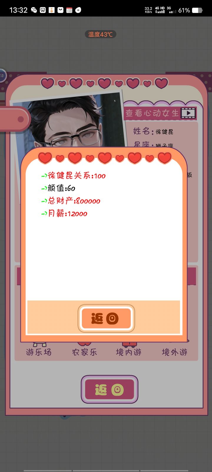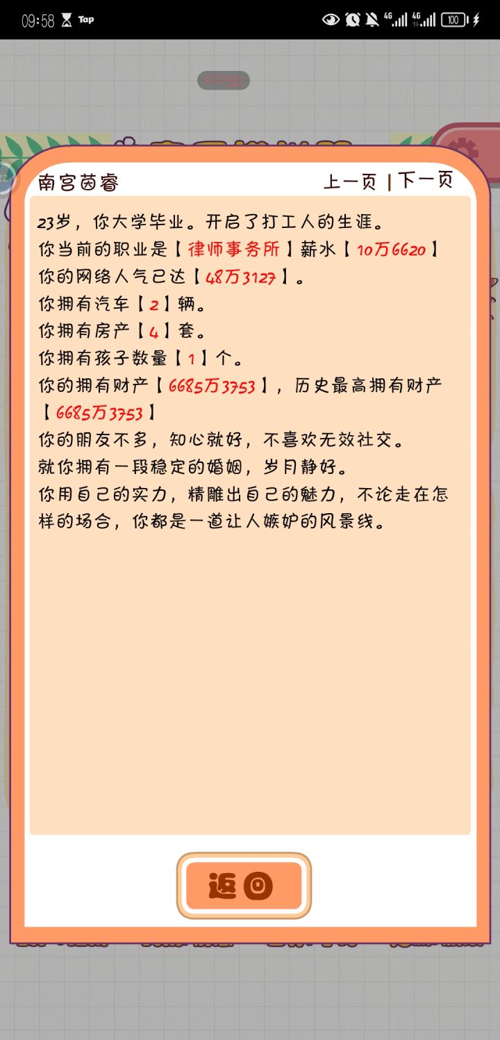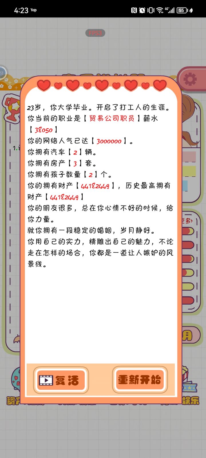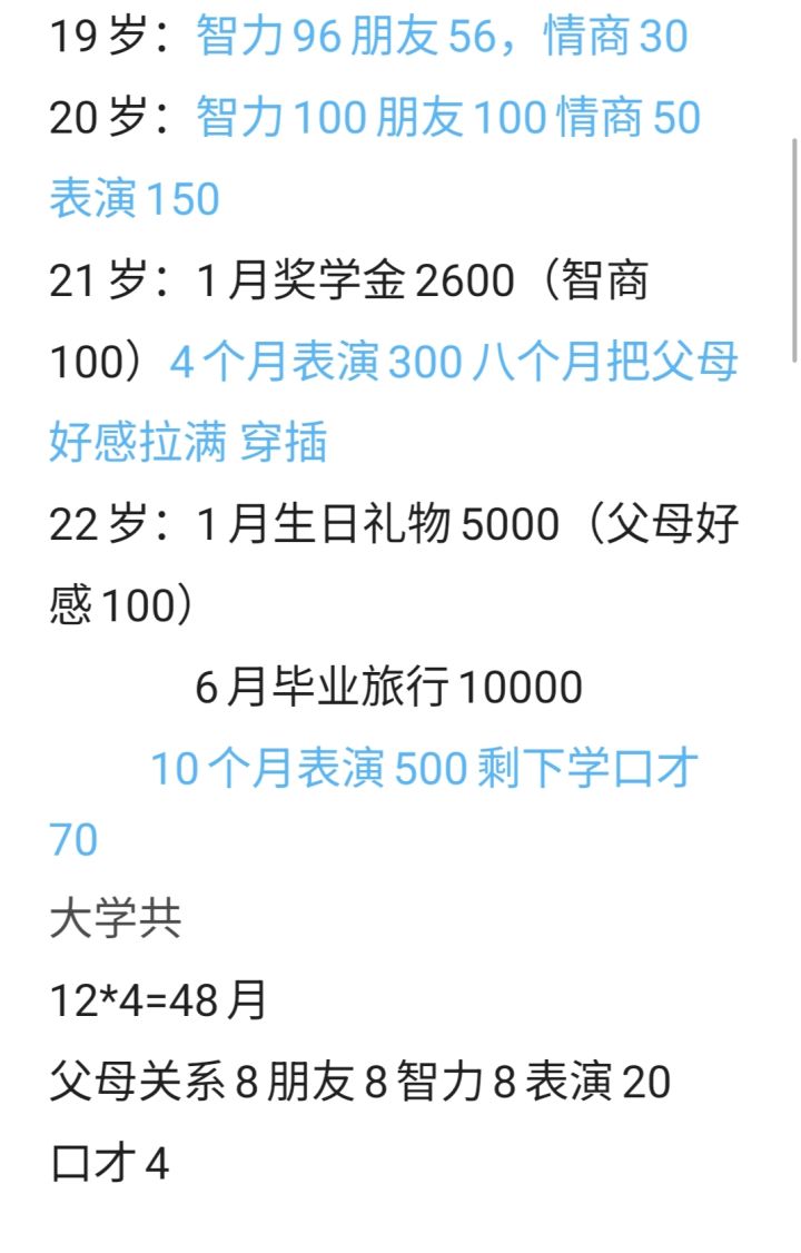 不知道为什么广告看不了所以数值都是肝出来的1.大学四年的时间分配如图二,父母给钱都得满好感。看别的攻略说父母25-29概率买房,但我没刷出来。2.情商是看别人攻略去农家乐,这样心情礼物情商都出来了,但是有时间限制,我就请了闺蜜刷好感情商就达标了3.智力上学时期就刷100,毕业之后去的贸易公司,这样上学时期不用考证,一些数据毕业就刷不了了4.毕业找到工作之后开始刷网文和直播挣钱,不用加班,每