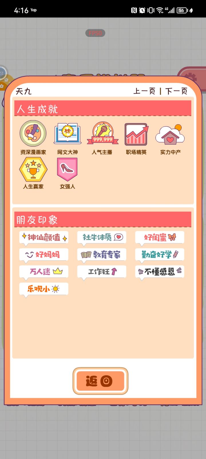 只需一局,便可获取至少15个人生成就,也就是15张vip。要点:❶大学四年,每个月都要问父母要零花钱,刚开始几个月,先把快乐拉满。❷每一个角色的好感都要刷!父母的好感影响影响你做主播时候的人气。两个好友的好感可以获得健康点和魅力点的道具。7个男朋友的礼物需要用,而且需要很多。详细安排:①19岁满快乐开始先刷漫画社团,绘画能力大概到200左右(为了后面考证的资金打下基础)②然后大概是20岁中