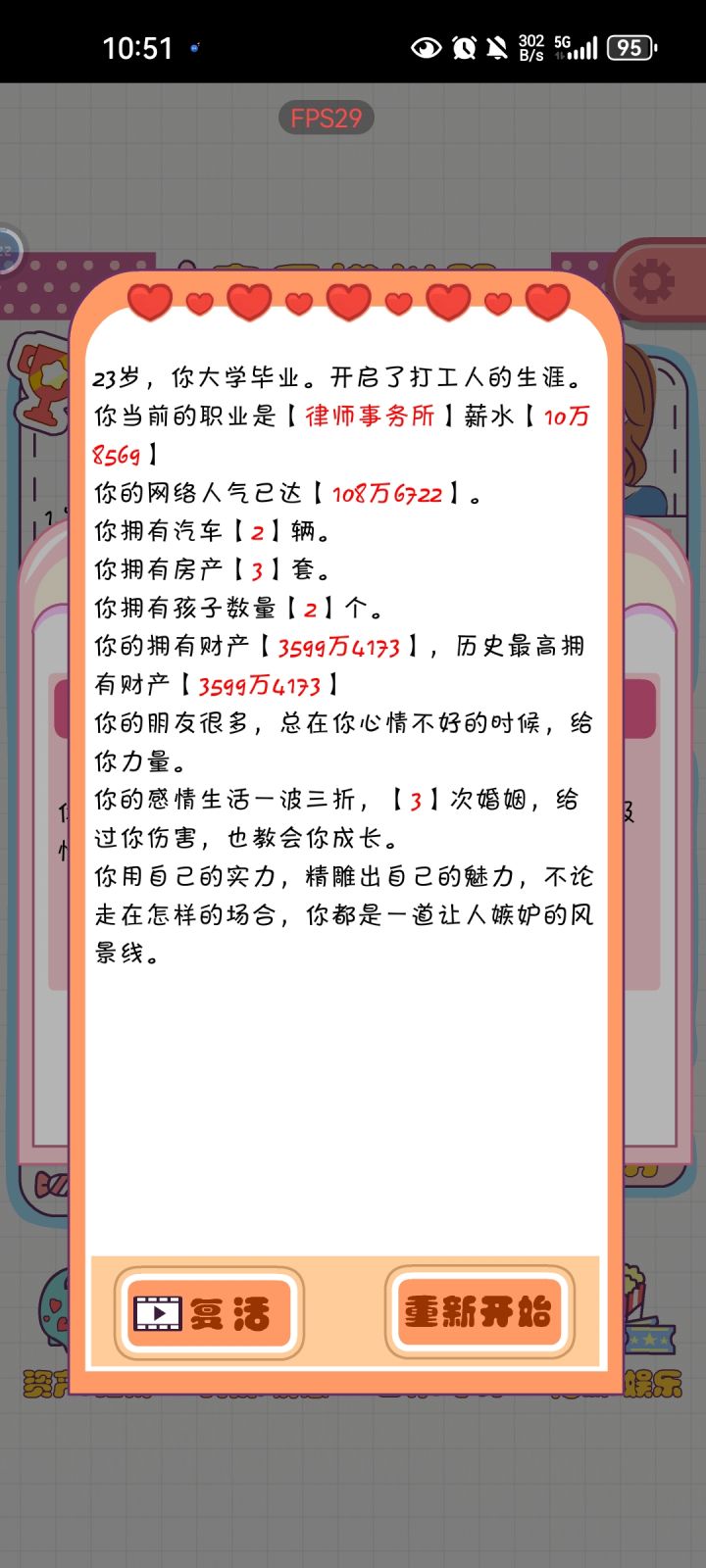 一周目玩到4kw资产,八个成就,蛮完满的一盘,简单理一下流程以供参考。1.大学期间三件事:1)要零花钱,同时刷父母好感(至少要维持在健康水准,否则可能影响工作);2)提升情商智商,最好到80及以上;想当律师的话口才要到100。3)兼职and考证,兼职长期来看最好的是写网文(没试漫画不知道会不会有相似的情况),因为会有改编等版权收入(15~40w)and人气收益(和直播收入挂钩,且是和富二代结婚