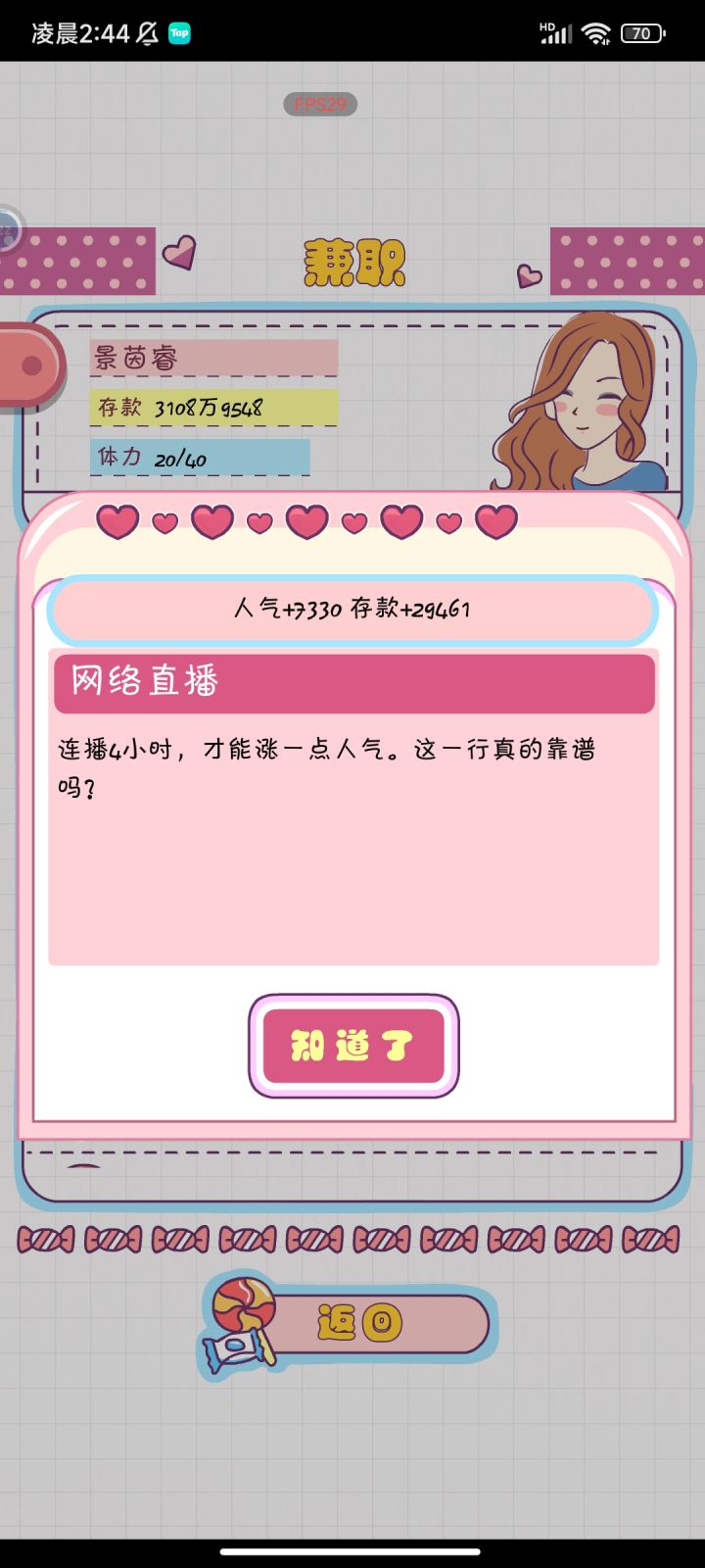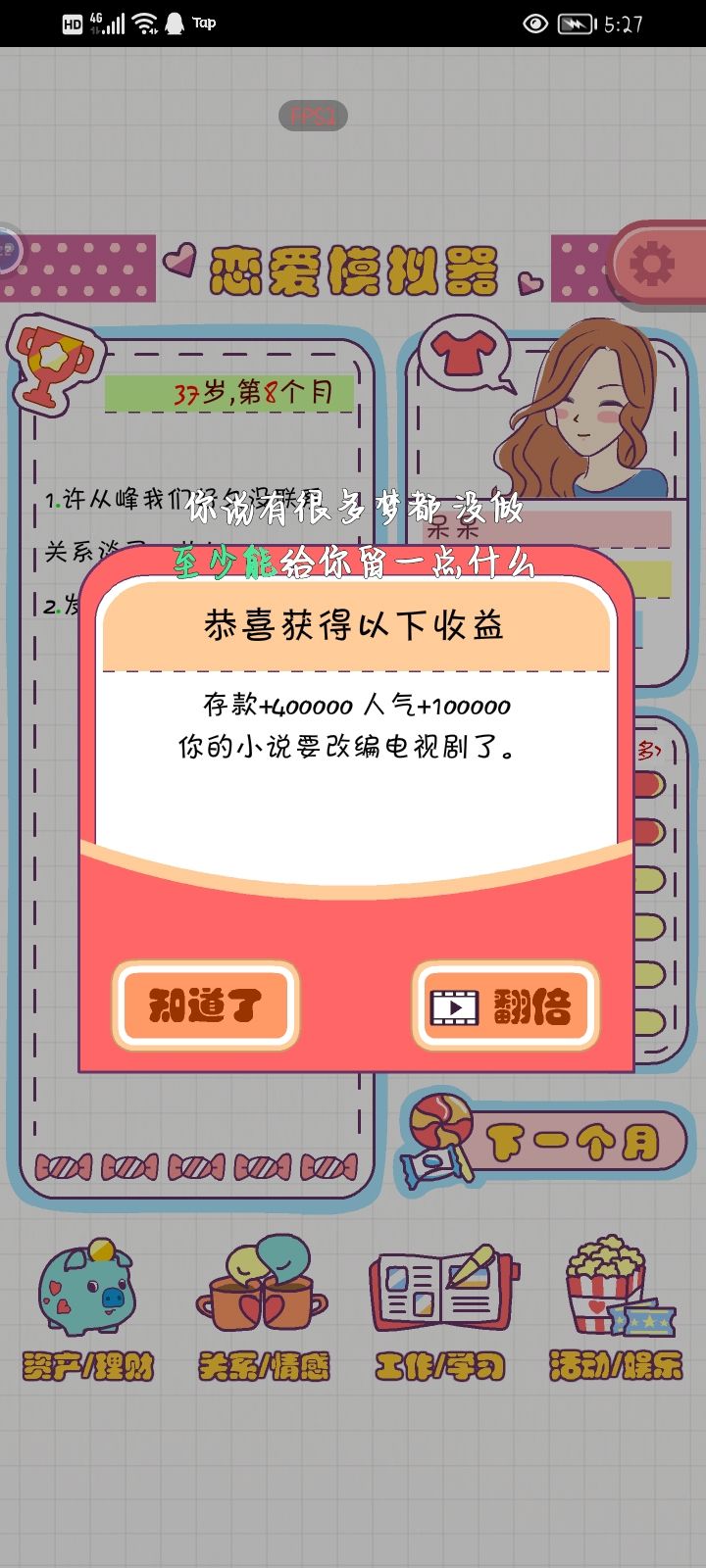 1.写作能力350之后,每年8月概率小说改编40万钱和几十万人气,看广告翻倍350就有概率了,后面直播之余慢慢刷就好不要强求,刷这个还是挺漫长的2.直播前期最赚钱最舒服,后期老了之后钱不多了但是!!!带孩子直播一个+1w左右,我带两个一次2w+模特好像前期是1500我觉得倒是没啥必要,直播和写作后面慢慢就有这么多了,还涨属性3.工作时刷刷智商和情商,会涨工资,我后期工资8w创业后14w智