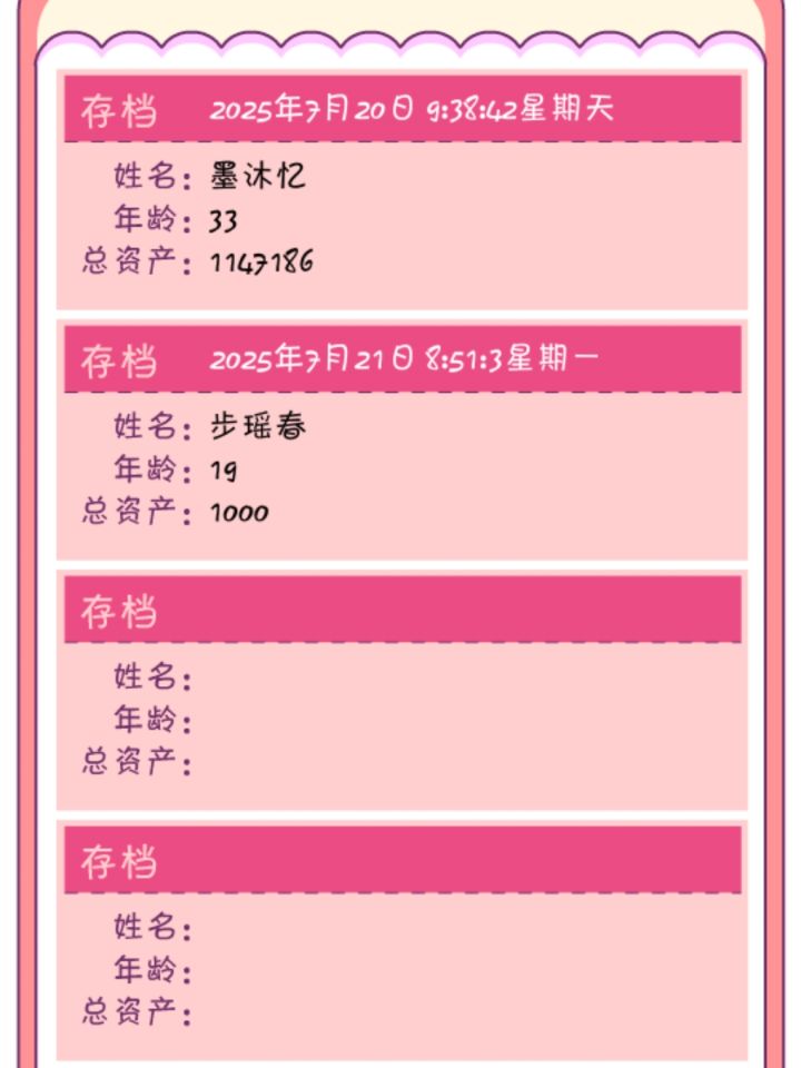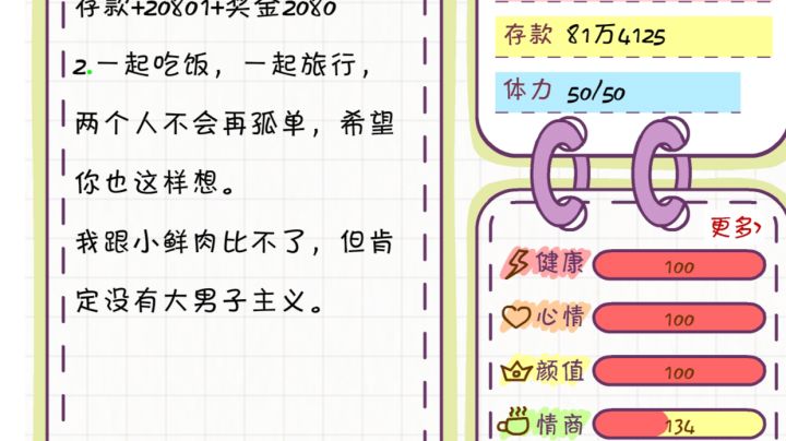 真的六六六 我玩了三个多快4个小时吧,一直在工作攒钱,工作攒钱,刷好感度,养孩子,那个二室一厅的房贷我都还了很多了。在40多岁的时候资产一共有400多万,还创了一个业。一切生活美满的时候,突然间白屏了,我怎么返回都是白屏,进也进不去,等我划掉后台再次返回的时候,他给我来了一个大反转:进去变成了30多岁,80多万的财产,而且是刚结婚的时候,工资一个月才2万多,而我把工资刷到一个月5万多,刷了很