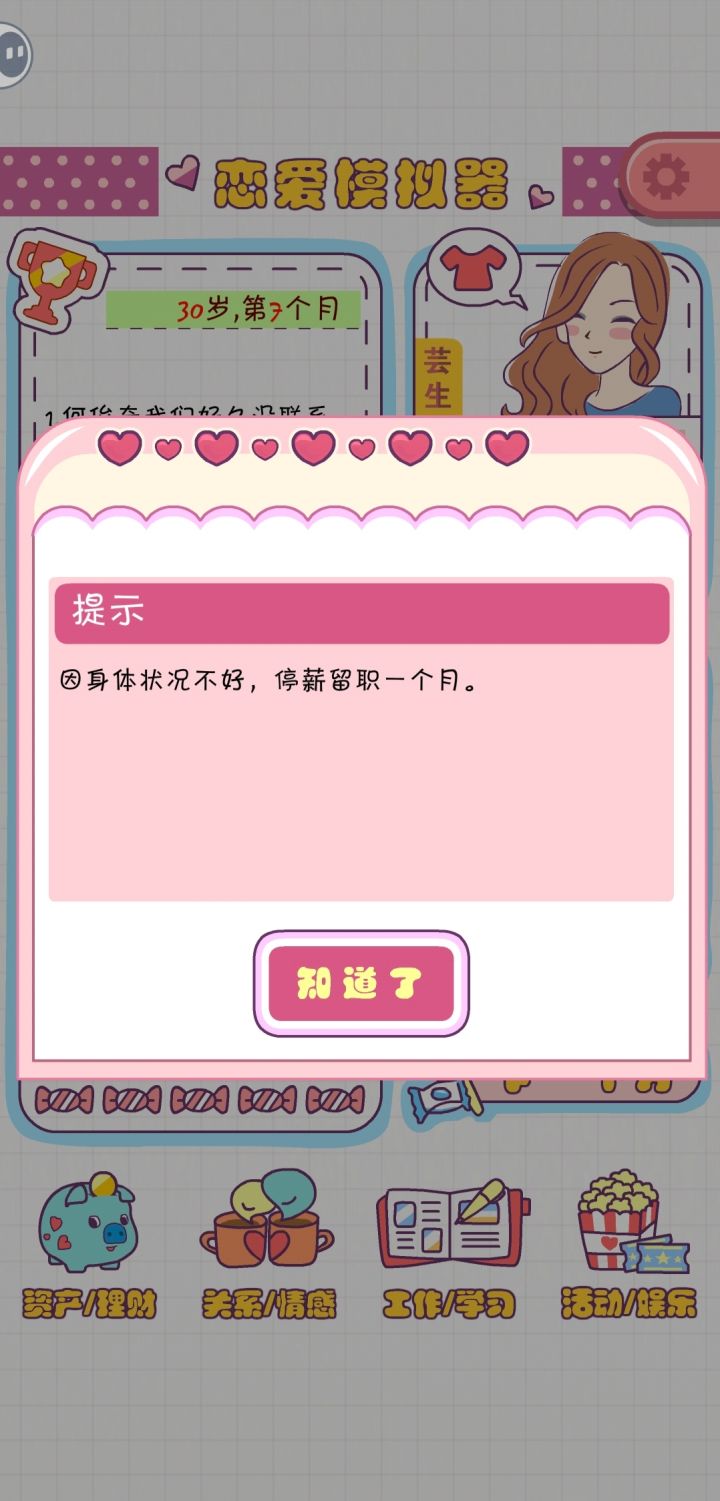 心情不好就啥也干不了了呗,前面是房子小每个月心情一增加超过40就减十,三十多除了娱乐啥也不让干,这不变相强制要求玩家买房吗?这很不合理啊,现实心情不好不也继续,后续进行就不买,啥也不干,每个月只领工资,最后的结局就是如此,没意思模式单一不说,游戏体验也不行#恋爱模拟器