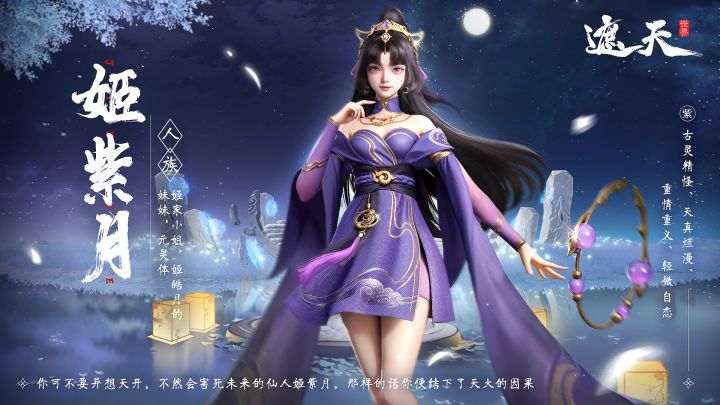 道友们好,本期依然是小天为大家带来的遮天道友录~今天要为大家介绍的,是一位古灵精怪的小姐姐——姬紫月“我不想死呀,想我姬紫月风华绝代,艳冠天下,还没有成仙呢,怎么能陨落在这里……”种族:人族背景:她是姬皓月的妹妹,拥有可以与万物本源相合的元灵体。世家大小姐出身的她天真烂漫,对俗世充满着好奇心。虽然有点轻微自恋,但她与他的哥哥同一样重情重义。若是未来与她一起她上了证道之路,记得让着她一