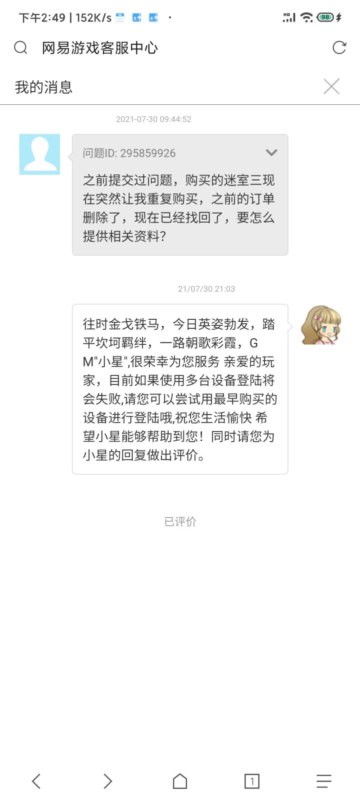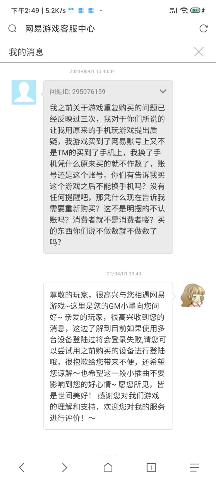 要的信息我都放在这了,迷室3的gm就是这么告诉我的,让我用原来的设备,我现在换了设备就没办法登录了。你们的回应就是如此,我打电话说给我上报,结果给的回应是找gm,gm两次回应,一次是我问问题,一次是我质疑,全都给我一样的答复,且根本没办法回复,这就是处理问题?你们给个理由就这样打发我了?你咋不回应说这个游戏期限一个小时过了时间就不能玩呢?为了18块钱是小事,我就是不服为什么让我重复购买,你们一直说手机有没有问题,为什么就不能是你们的问题,你们有积极的处理过恢复过吗?我手机能有啥问题,我魔幻手机吗?就这样吧,不行就12315,我就不信了,还不能维权了