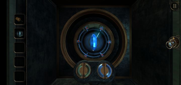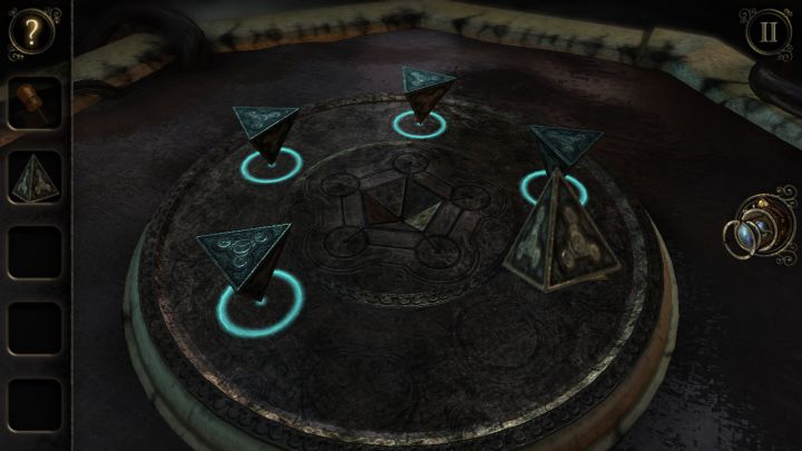 接第四章第五章略短首先还是来到放三角的台子前5个三角会结合成一个,得到工匠的钥匙同时墙上会出现一道门进去,来到房间里放上钥匙这个装置会展开在边上找到金属环来到一旁的建筑物处放上金属环,旋开带物镜进去左边拉杆控制齿轮上下移动,转盘控制齿轮转动按下右边的按钮然后来到中间的划片处左滑改变光的轨迹就能去拿到侧面的玻璃片安上打开物镜进去左边按钮是旋转固定两个光源,右边是