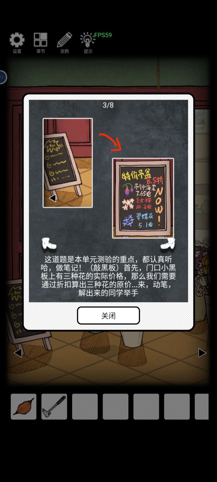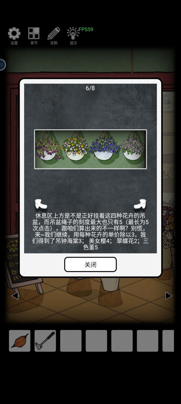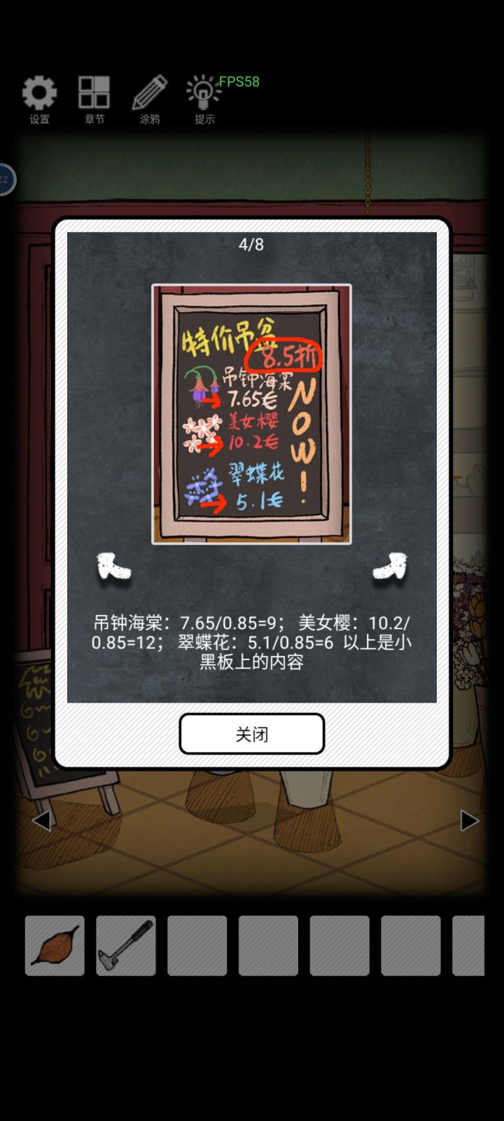 攻略作者:迷失攻略组-Neath未经许可,禁止转载,侵权必究!💡更多图文+视频攻略可搜公众号🔎迷失攻略组(也是第一时间放攻略的地方(^U^)ノ点击跳转: | | | | 花店攻略19、在三个花盆里拿到【植物1、2、3】,移开粉色花盆拿走【多肉盆栽】。1920、点击左边的牌子,根据8.5折算出,吊钟海棠原价是9,美女樱原价是12,翠蝶花原价是6。2021、向右移动,拿到笔筒里的#攻略#游戏讨论
