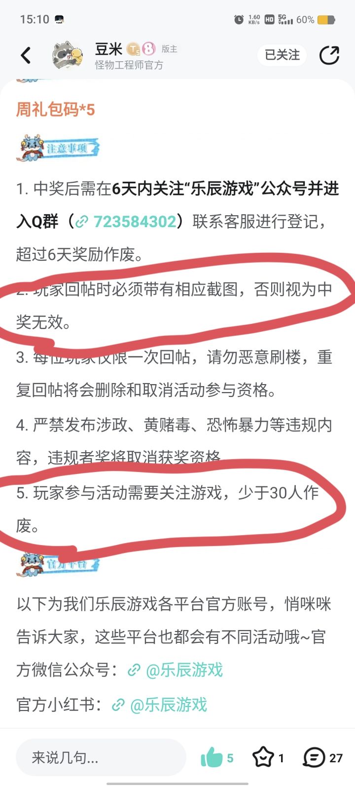 先不说礼包码能不能免费送这件事了,你们发的话是真的一点都不看呗。如图一:不满30人作废嗯给我的话这是好事,不给的话.....不患寡而患不均吧我肯定是不乐意的。我们这么多人,这么多号没一个中的确实很失望你要是天天抽可能还不会沉浸在没中的失望中,一年半载就这一次你说气不气,活动一出其实我就发了,后续还被删了评论(不理解可能是活动改了吧)最最最最离谱的是:你们说好的没图片不算呢???我看着大家没放图片