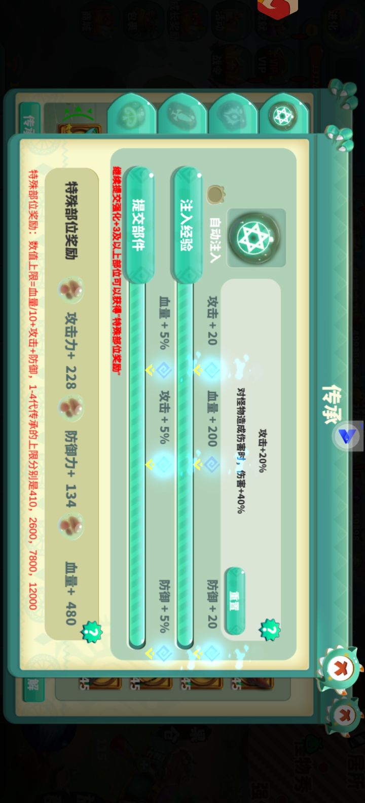 1.传承系统18 级 之后开启,后续等级达到可以逐渐开启新的传承开启之后分两种,第 1一种是经验注入,注入一定的经验,达到数值之后可以提供血量防御攻击加成;第二种为装备喂养,提交不同等级的装备可以获得成长值,达到一定数值奖励百分比的血量防御攻击加成,两条传承都满之后会获得两个词条,具体数值可以看(图 2),词条可以通过共鸣结晶刷新,共鸣结晶可以从多人竞技场,商城购买(1000/1 颗) 及 35