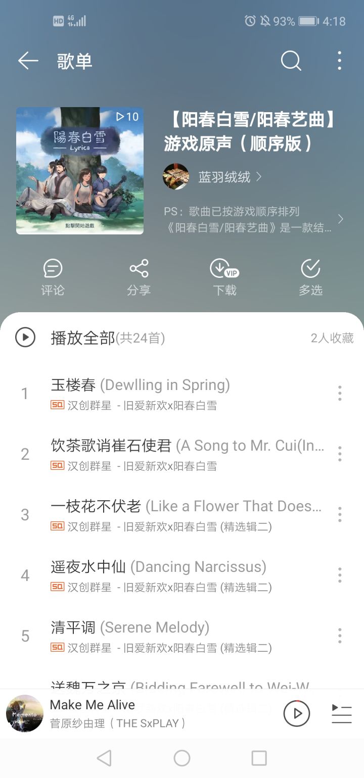 因为网易云之前和阳春白雪有关的歌单都不太纯粹,所以在国服出来前就自己建了一个歌单。歌曲全部按游戏顺序排列,目前把网易云有的歌都找出来了(其实还有一个乡野乐活但是那个质量不太好就没有放到歌单),希望能给各位新玩家提供一点便利(^_^) ,以后网易云上架新歌也会同步到歌单的~蓝羽绒绒创建的歌单「【阳春白雪/阳春艺曲】游戏原声(顺序版)」: http://music.163.com/playlist/