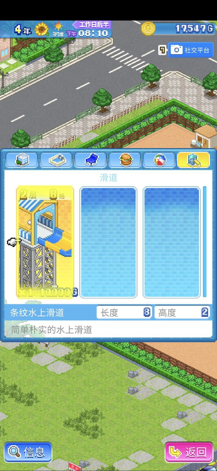 1.开局为了刷任务,可以搞三个池子,其中一个大池作为主要投入,所有增益设施和游乐设施都盖在旁边,另外两个弄成1格即可