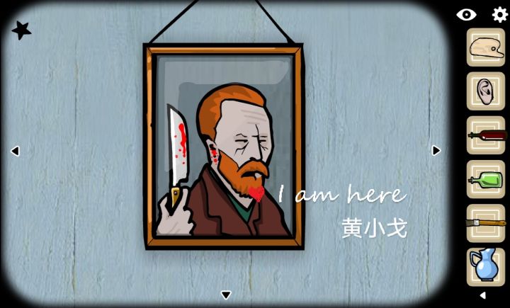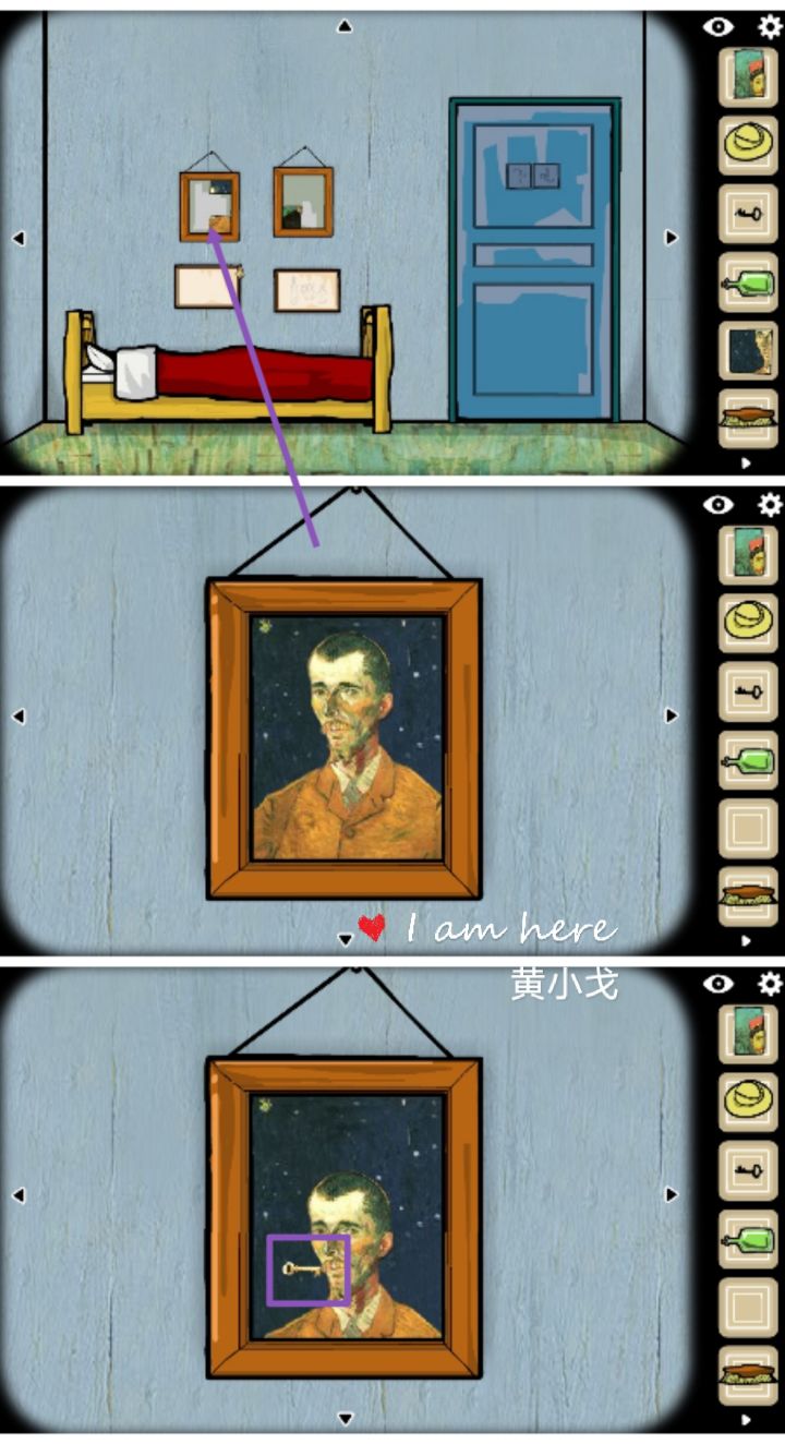 1.(房间口场景)点击墙上的画,在第一幅画后面获得【油画碎片】2.撕开第四幅画的右下角,出现一个符号3.(房间场景)点击床头,获得【帽子】4.点击第二件衣服,钥匙掉落,点击拾取掉落在地上的【小钥匙】5.点击移开两个枕头,出现一个符号和【苦艾酒瓶】6.点击窗户旁边的画,获得【油画碎片】7.点击桌子,获得【水壶】和【刷子】8.在桌子抽屉获得【画笔】9.(门口场景)在椅子旁获得【油画碎片