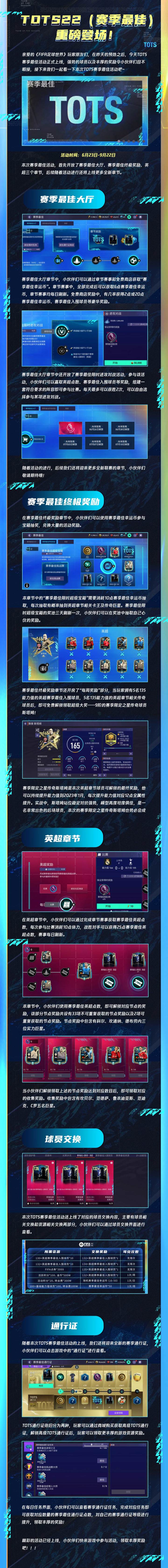 亲爱的《FIFA足球世界》玩家朋友们,伴随着欧洲赛场各大赛事的结束,我们也即将在这炎炎夏日迎来一年一度的TOTS赛季最佳活动。接下来就让我们一起看一下都有哪些在上赛季表现抢眼的超级巨星,进入了本次的赛季最佳活动吧~活动时间:6月23日-9月22日本次赛季最佳活动,首先开放了赛季最佳大厅、赛季最佳终极奖励、英超三个章节,后续随着活动进行还将上线更多全新章节。赛季最佳大厅赛佳最佳大厅章节中,小