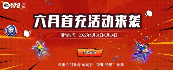 亲爱的玩家,《FIFA足球世界》首充活动来啦!玩家在活动时间内进行充值即可解锁相应奖励,本月首充更新了月首充和历史首充的奖励,多名高阶球员和海量转会费、强化和转移材料静候您的领取。(历史免费玩家充值可以前往本次活动的“历史首充”版块进行奖励解锁)。活动时间:2022年5月31日~6月14日,领奖时间截止至15日。活动地址:前往游戏界面“限时特惠”或 >点击立即参与<活动规则:一、本月首充回