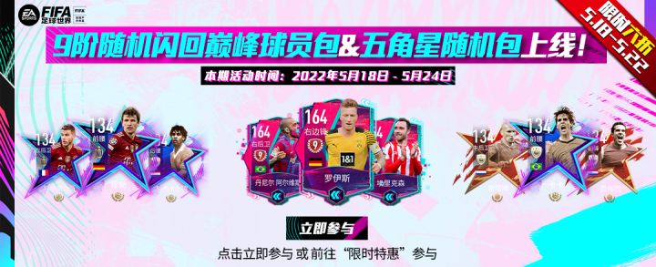 FIFA足球世界点球大战更新!自选奖励自配奖池,想要什么你说了算!海量资源包、球员包、礼券以及高阶球员,等你来领!本期活动时间:2022年5月13日~5月19日5月13日~5月15日,限时7折参与地址:游戏内点击界面“限时特惠”参与 或>点击立即参与<活动内容介绍:1、玩家进入页面后,点击奖池中足球即可自行在奖品池中挑选奖品组成12宫格球门,奖池分为四类档位,至尊金球、炫彩紫球、绝代银球