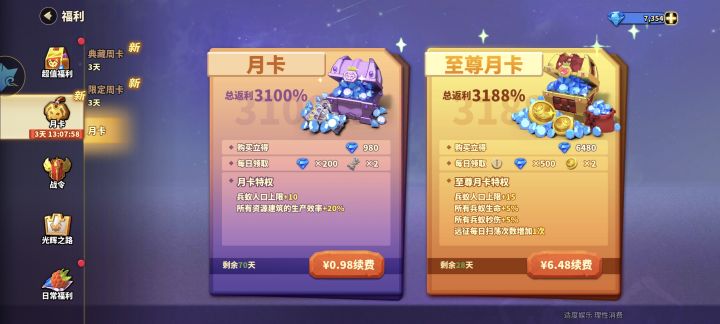 月卡太贵,国内游戏最多30元一个月,不知道这游戏哪来的勇气出68元一个月的月卡!这游戏68元一个月的月卡,一样的价格,其他游戏我能买9个月双月卡,你说大家不跑,玩你们游戏做什么!