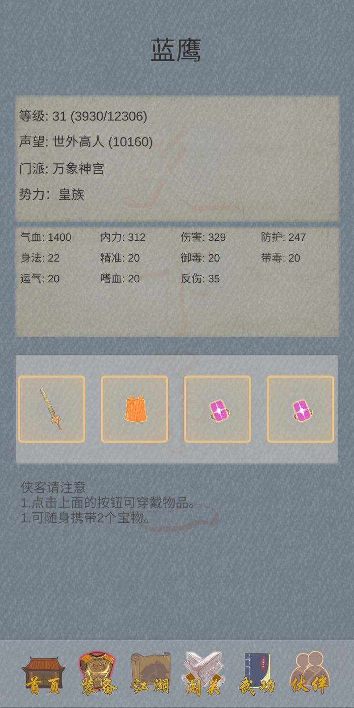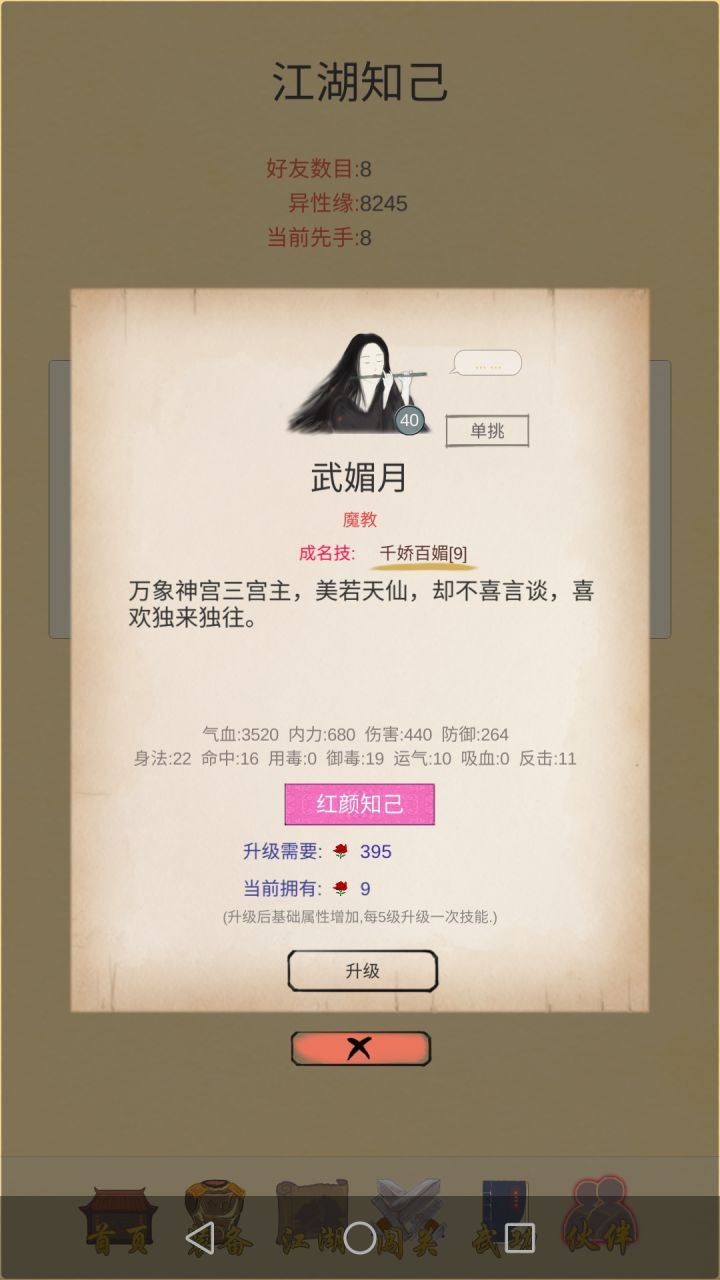 玩了一晚上终于通关了,写下技巧:前期人物招到手可得先手出招躺赢一波:万福镇,找到‘小白’,庙会大街’,找到‘花灯铺子’,猜完‘灯谜’拿到‘花灯’去戏台对话,‘翠儿’入队,99瓶美酒去东海的蓝冰岛,找到‘辛十九’点结义,前期略强队友郑浪:买100瓶美酒,去吴兴城的‘道场山’和‘郑浪’对话,点结交,超强队友‘武媚月’:常规拿完所有东西之后过完第五章节主线,去大漠找到‘问情老人’,和他对话输入你第五章主
