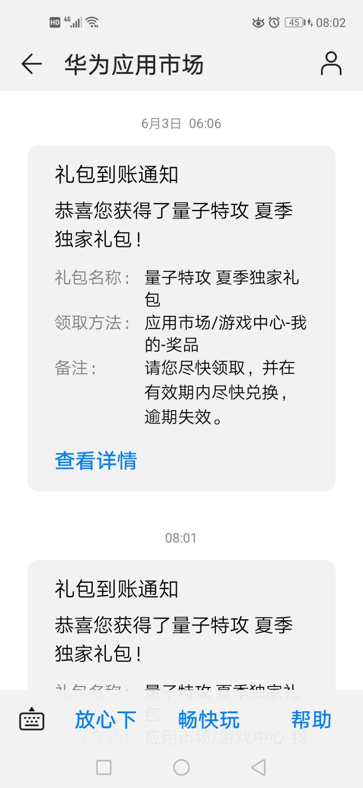 之前反馈的礼包领不了,原来是华为游戏中心发的信息,图来了