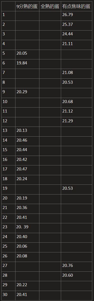 【全熟的蛋】测试 使用Windows自带时钟从第三下敲蛋(下锅)开始计时,测试了30次有效数据,最接近的两组数据分别是20.47秒的【9分熟的蛋】和20.53秒的【有点焦味的蛋】,据此推测【全熟的蛋】会出现在20.50秒。 另外,蛋下锅后会循环播放“啪啪滋滋滋……”的音效,周期约1秒,无秒表时可依据声音推测时间。