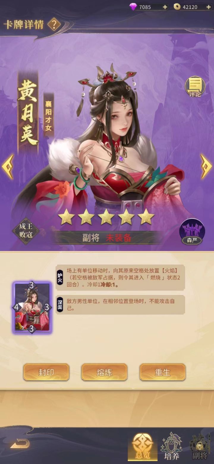 弈魂师们好呀~距离第二次删档测试日渐临近,本次除了有新版的技能优化调整外,还有英雄卡牌的变化调整,弈魂师们一起提前熟悉部分新英雄卡牌吧! ↓↓ 以下英雄卡牌展示等级均为满级↓↓(英雄卡牌上线前可能会有调整,以游戏最终线上版本为准!)「黄月英」 技能1【妒火】:场上有单位移动时,向其原来空格处放置【火焰】(若空格被敌军占据,则令其进入「 燃烧 」状态2回合)。冷却1技能2【深闰】:敌方男