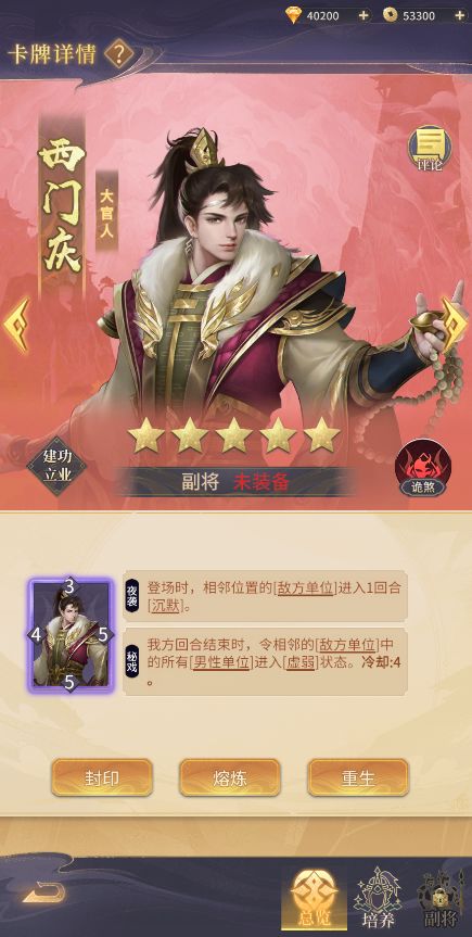 距离第二次删档测试日渐临近,本次除了有新版的技能优化调整外,还有英雄卡牌的变化调整,自新卡揭秘第一弹推介了黄月英、郭嘉及杨婵等英雄外,本次亦将继续揭秘的新英雄卡牌如下。 ↓↓ 以下英雄卡牌展示等级均为满级↓↓(英雄卡牌上线前可能会有调整,以游戏最终线上版本为准!)「西门庆」技能1【夜袭】:登场时,令相邻敌军所有技能暂时失效,直到本回合结束。技能2【秘戏】:我方回合结束时,令相邻所有敌方男