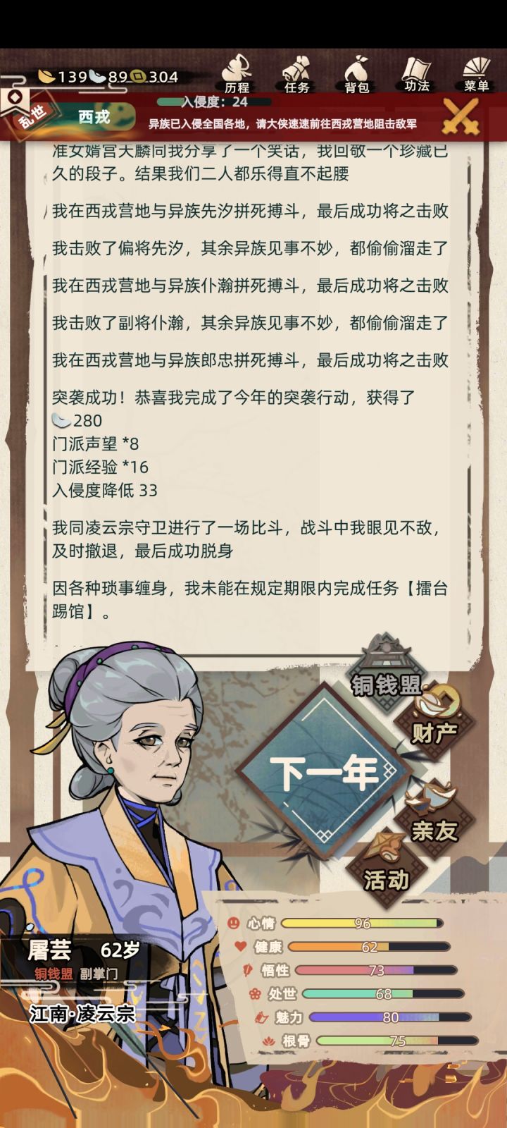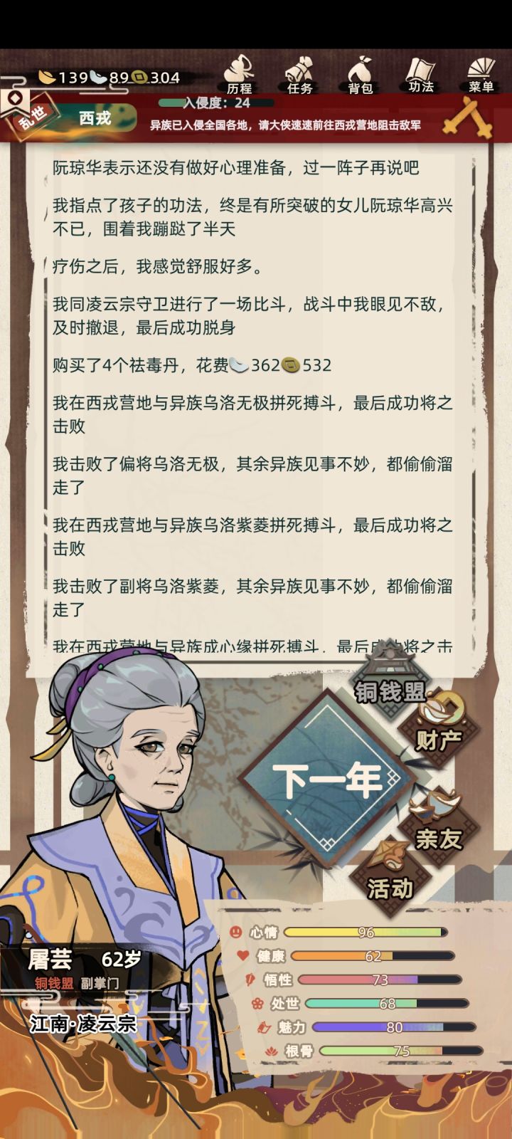 还在打仗呢,在敌对帮派里总遇到人来跟我打架,甚至在我和异族打完健康剩下零的时候就拦着要打架,我都麻了。只能说怪不得没人抵抗异族啊,江湖上的人真的都很闲,闲得整天找敌对帮派的人打架,啥别人就算打过来了也是真的不管哈。讲真的这真的特别特别不合理,比抢亲的时候每个跟她/他走还不合理。比不能给儿女介绍对象还不合理。比好感度100的朋友(预备老公/老婆)突然结婚不能抢亲,甚至还没通知我去参加