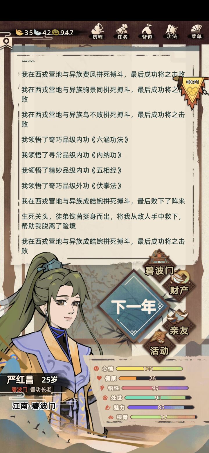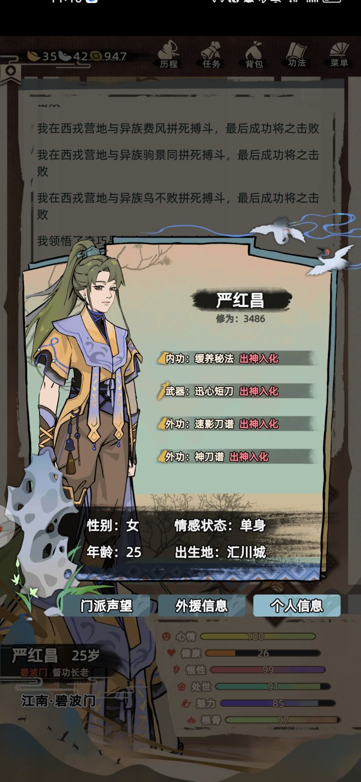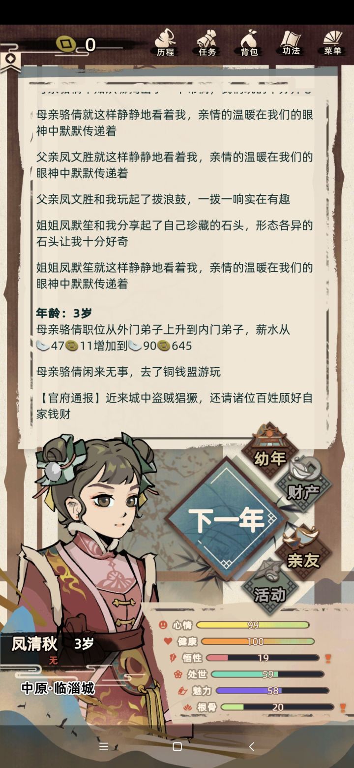 第一次玩就全满了,45岁了样子还是那么年轻,我怀疑是我看了《遵身养性》《礼记》等书籍的原因。我呢,一出生就是喜鹊登梅,吉祥之兆,生于中原临淄城,生的样子乖巧,我应该长相是随母亲较多,因为我妈就是个大美人儿,修为了得,还是大长老,我爹就稍稍普通点,是个荷官,但是都很爱我,家里还有个姐姐,从小集万千宠爱长大。后来成年了,妈妈催我相亲,我也答应了认识那位仁兄,但奈何我心在江湖,想无拘无束,做个侠女,