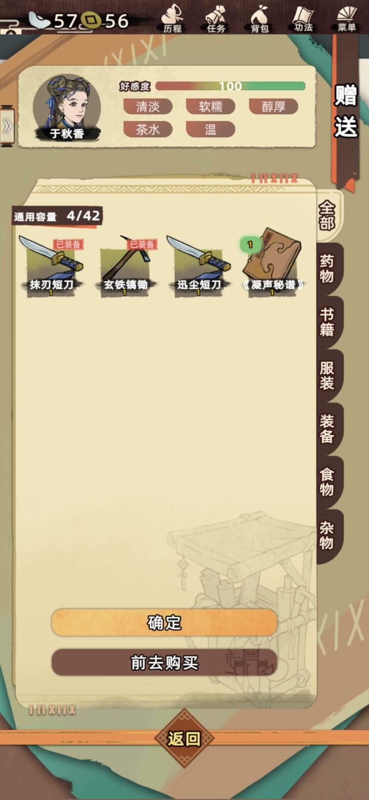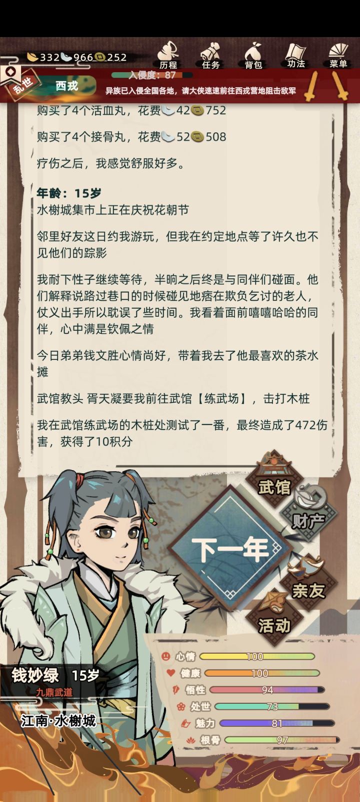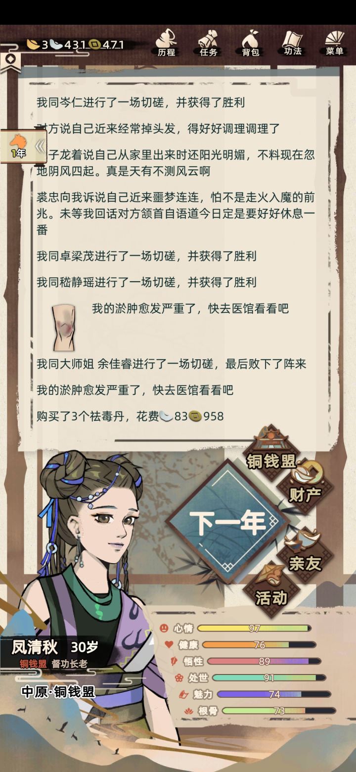 第一次玩就全满了,45岁了样子还是那么年轻,我怀疑是我看了《遵身养性》《礼记》等书籍的原因。我呢,一出生就是喜鹊登梅,吉祥之兆,生于中原临淄城,生的样子乖巧,我应该长相是随母亲较多,因为我妈就是个大美人儿,修为了得,还是大长老,我爹就稍稍普通点,是个荷官,但是都很爱我,家里还有个姐姐,从小集万千宠爱长大。后来成年了,妈妈催我相亲,我也答应了认识那位仁兄,但奈何我心在江湖,想无拘无束,做个侠女,