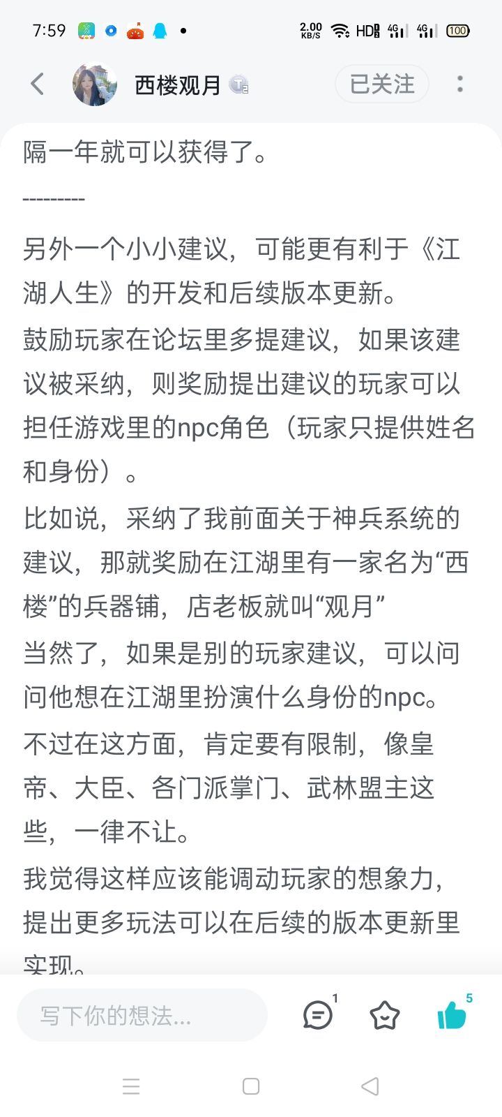 希望还是古代人生,当代人生那样的内核,而不是像其他武侠人生之类的被局限在游戏设定的那几个人物周围转悠,剧情也是跟着人物所说的各种任务到处跑当工具人,如果这样还不如没有剧情,全靠文本量出随机事件或者被牵入一段剧情且包含后续的那种比较稳,起码不千篇一律,所以文本量很重要,尤其武侠,少了就腻得快,希望能来点让人眼前一亮的感觉,或者经典的武侠片段剧情,当然长剧情也行