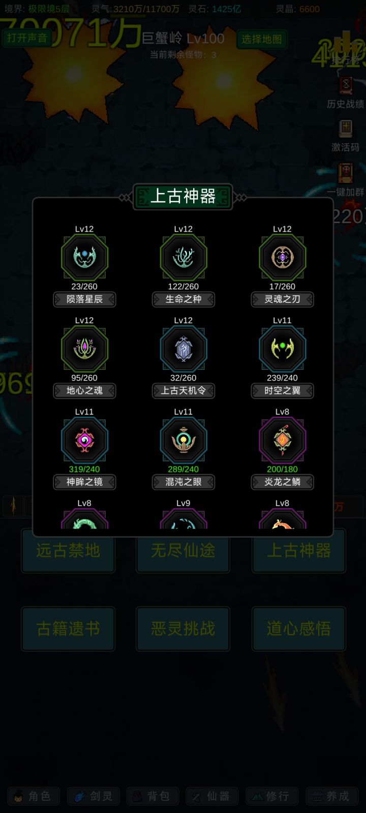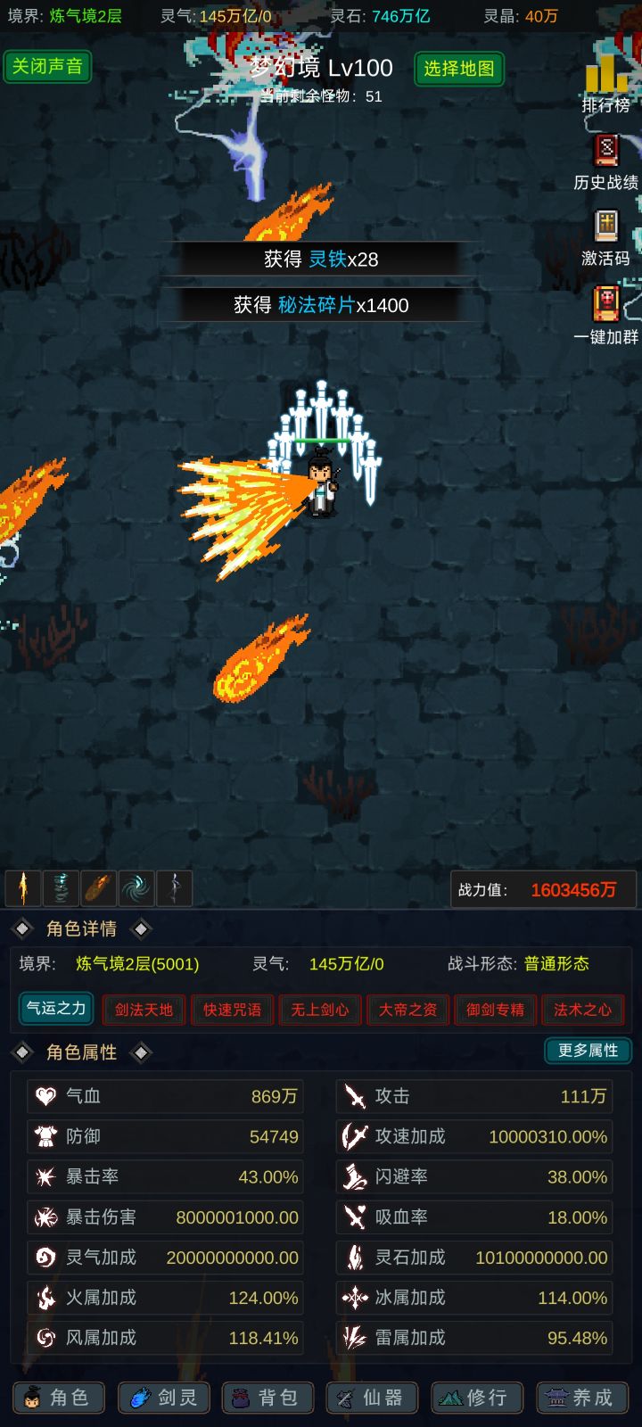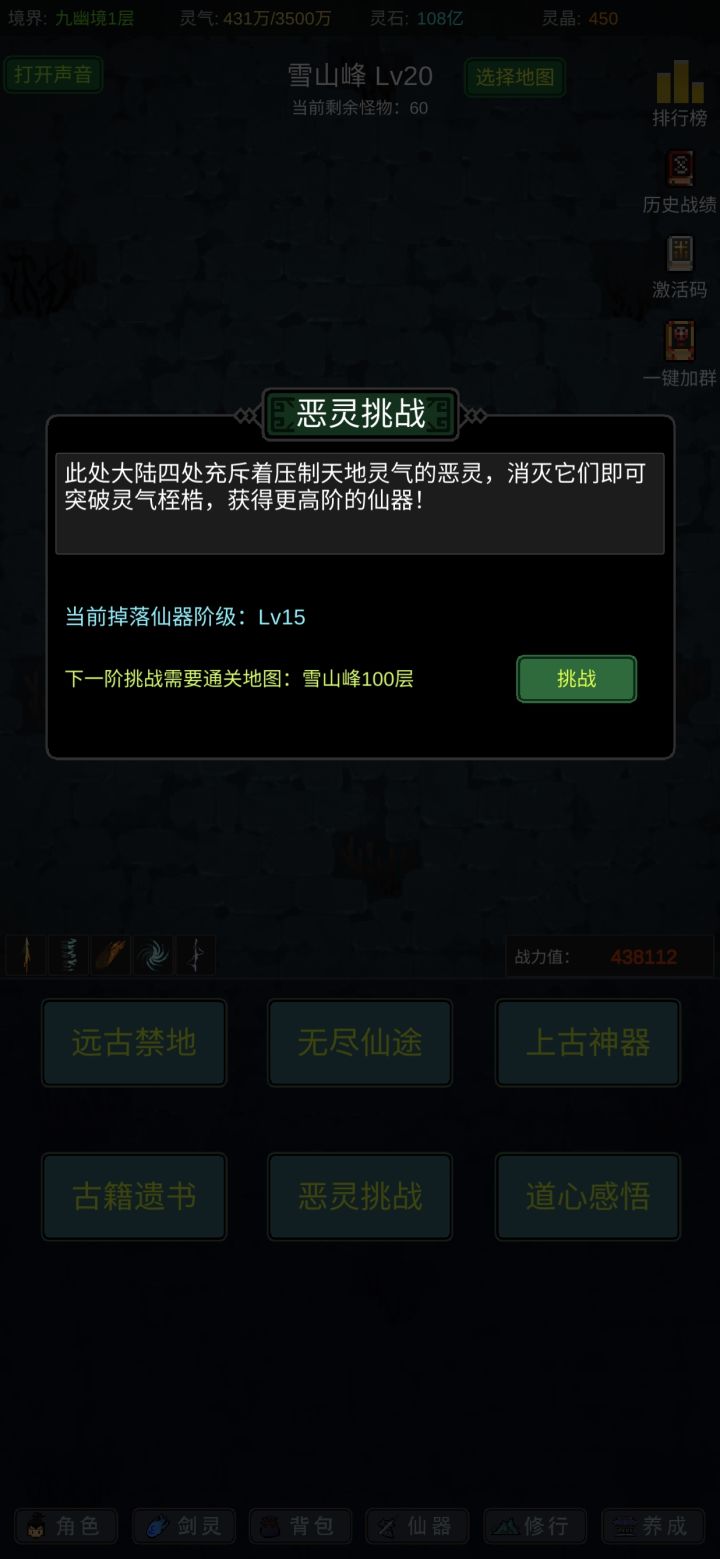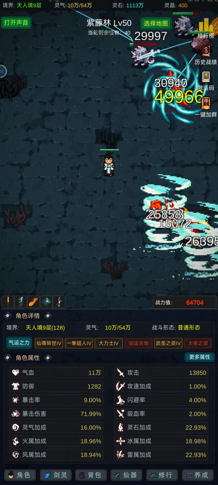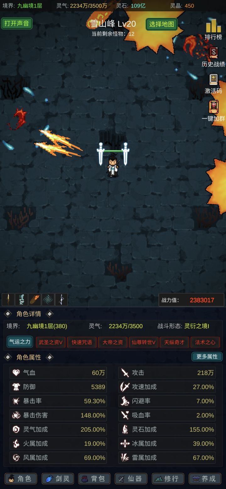 攻略应该有人写的七七八八了,我就不一一细说了,游戏内容也不算多,前期坚定一点只能玩“法修”就问题不大!其他的剑修、体修都是大后期才玩得起来,不然别说14阶,13阶都够呛能过,加点的话可以参考,我是法体双修过度到600级左右再转回法修,装备的话好坏看强化系数和词条,目前只有攻击和血量比较实用,过13阶大概需要血量300-400w,150w左右的攻击力,气运不同浮动很大,参考就好,等我过了14阶再回来
