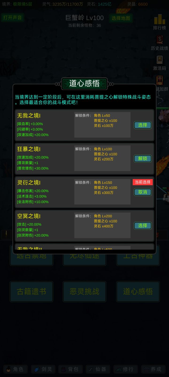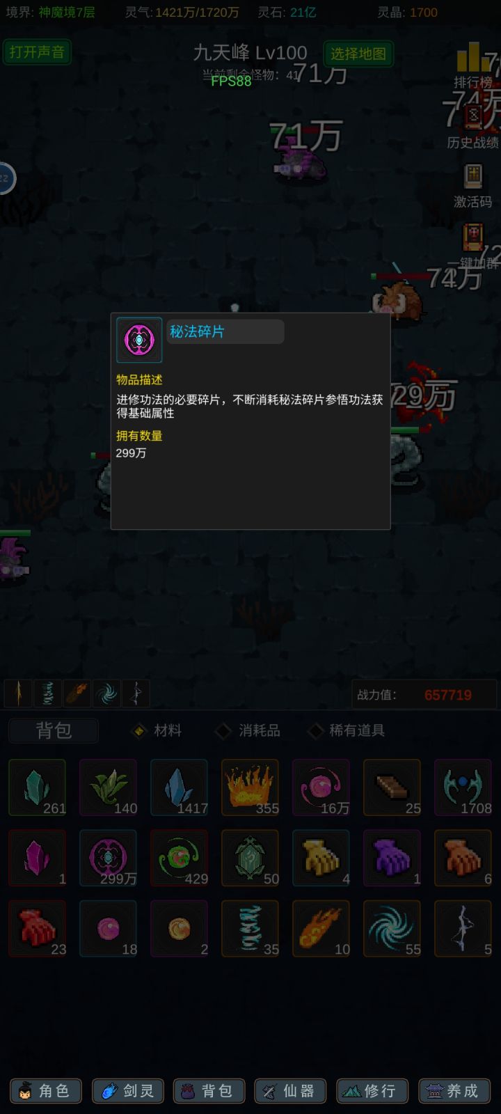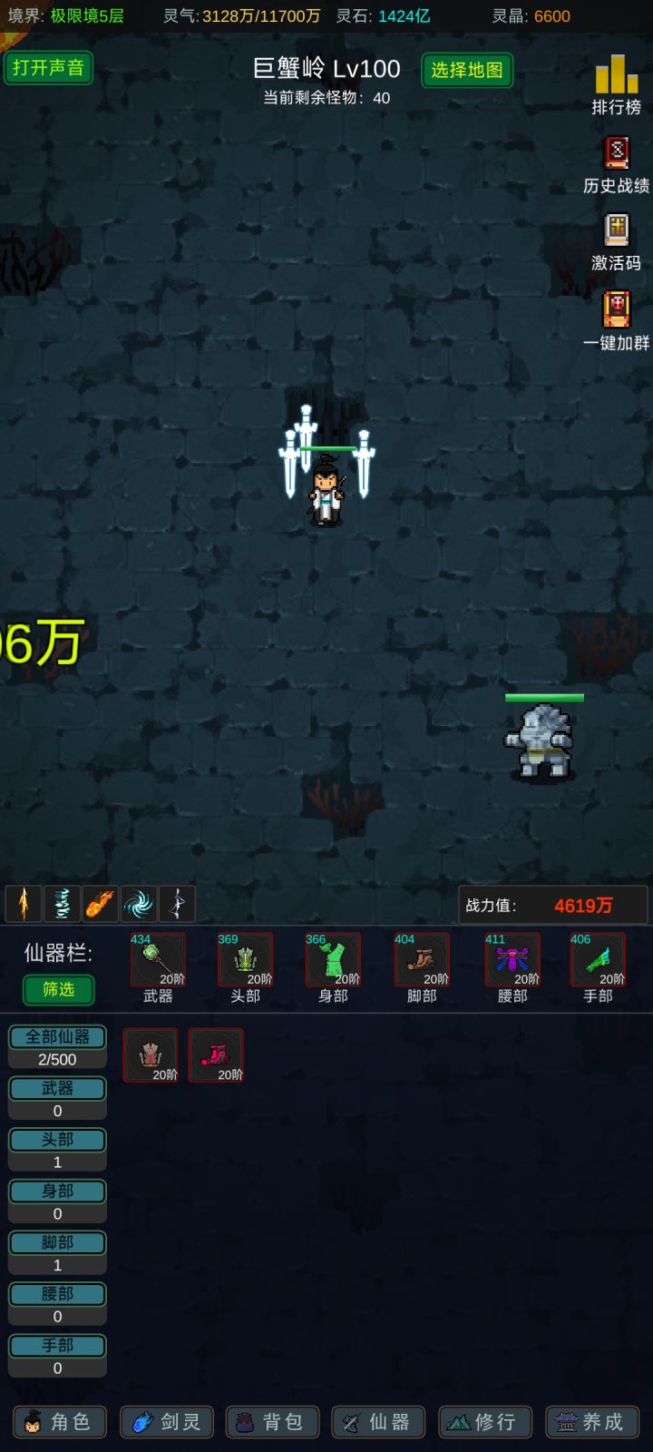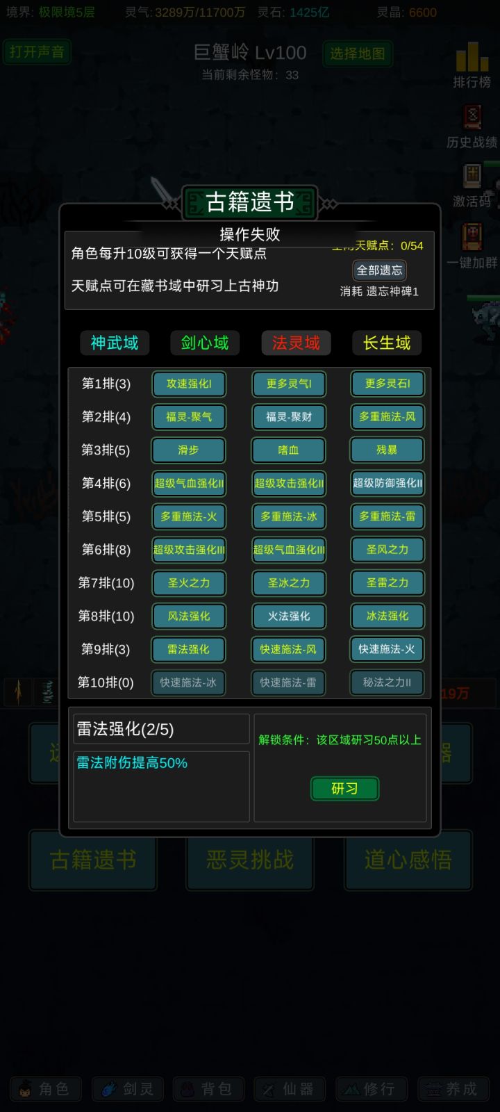 攻略应该有人写的七七八八了,我就不一一细说了,游戏内容也不算多,前期坚定一点只能玩“法修”就问题不大!其他的剑修、体修都是大后期才玩得起来,不然别说14阶,13阶都够呛能过,加点的话可以参考,我是法体双修过度到600级左右再转回法修,装备的话好坏看强化系数和词条,目前只有攻击和血量比较实用,过13阶大概需要血量300-400w,150w左右的攻击力,气运不同浮动很大,参考就好,等我过了14阶再回来