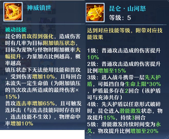 各位仙友日安~好消息,好消息!仙友们心心念念的仙兽昆仑,在本周更新后即将威猛返场!各位还没拥有的仙友们这次可千万不要错过了~昆仑返场,仙友们自然也很想知道这只仙兽究竟怎么养?今天小花仙就来带大家好好看看这只猛虎如何下山~*攻略内容仅供参考,请以游戏实际内容为准!从昆仑的资质来看,物攻和速度资质要比同类宠物高很多,毫无疑问他是一个敏攻宠物。昆仑的天赋技能【神威镇世】为被动技能,造成伤害时有几