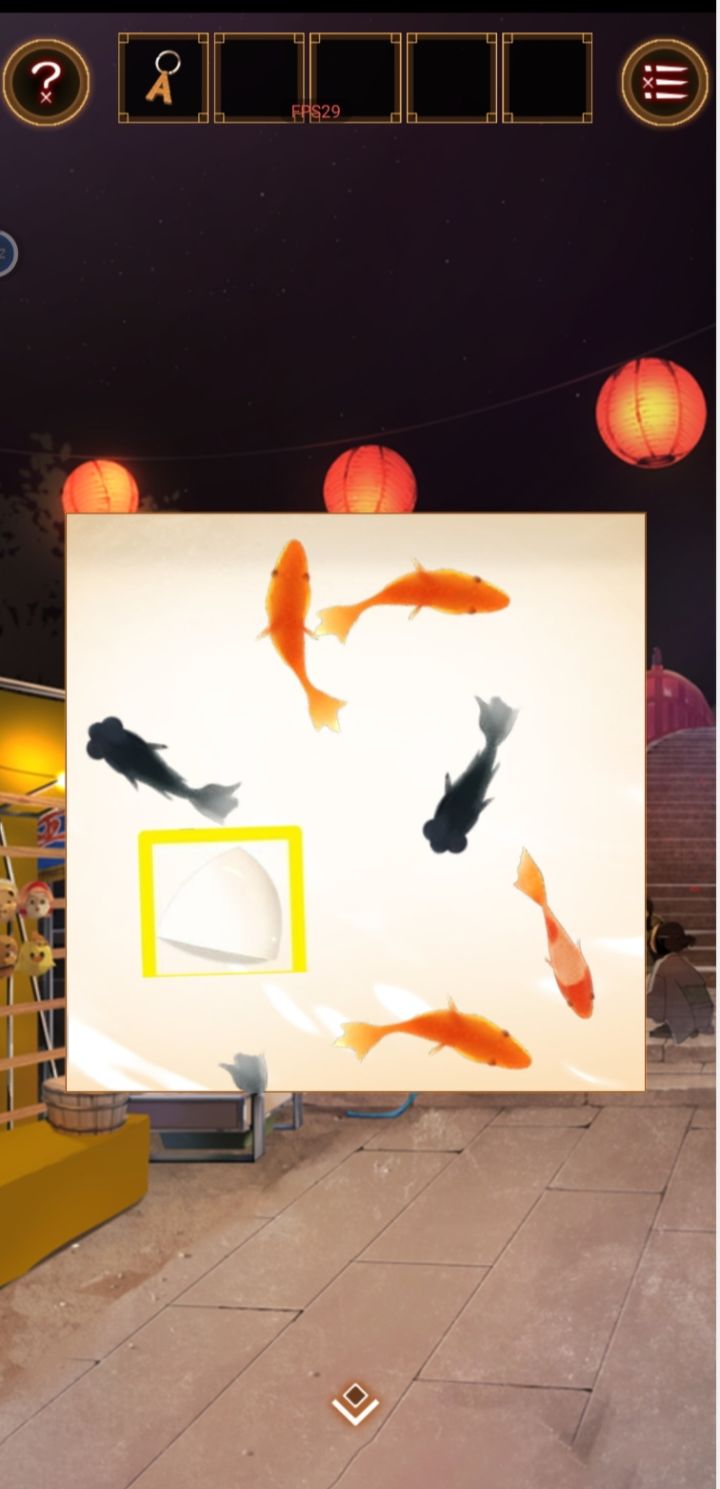 Chapter3(章节3)1.(庙会-桥)点击金鱼摊,赶走金鱼,获得【钥匙链】2.(鸟居前)点击面具人,触发剧情,拿【钥匙链】给他,获得【毛巾】3.(庙会-桥)点击水管,使用【毛巾】,获得【湿毛巾】4.(庙会-右)点击热狗摊的招牌,用【湿毛巾】擦掉上面的污渍5.获得线索:大量色彩6.(庙会-桥)点击木桶,根据招牌上的线索,调整密码锁:大量色彩7.木桶打开,获得【水球】8.(隐藏面具