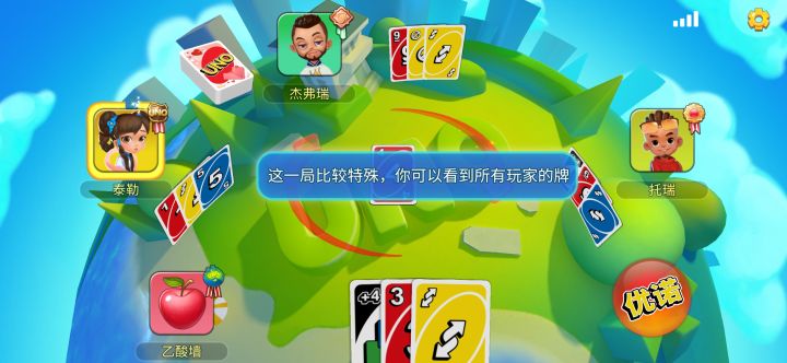 很多人出牌不知道怎么出好,uno是需要配合和策略才能体会到游戏的乐趣,个人建议各种加二加四牌在敌方牌不小于等于3张,不要主动出,禁止牌看对家能否接手,旋转牌看上家他如出了同色全出功能牌可出同色旋转牌逼上家拿牌或逼出功能牌,万能色牌看自己双方没牌可出或留着最后自家双方一两张牌再出,这些功能牌前期没以上情况尽量留着。同色全出功能牌也不一定非要一上来就出有时留在后面也有可能偷鸡,看情况还有一点