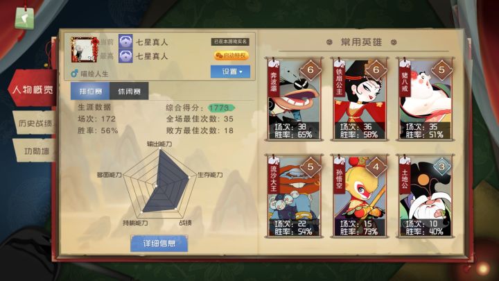 单排上了七星,成功拿到皮肤!胜率不高,单排很容易翻车,用奔波霸上到五,后面就是用猪八戒,铁扇,孙悟空,其他的偶尔也玩玩,只会玩一个英雄是很吃亏的!其实保证自己不坑的前提下打到七星还是很快的。ban位通常给了虎力大仙,会玩的虎力大仙很无解,1v3都不成问题,单排建议ban掉,至于猪八戒,嫦娥,土地公,唐僧也经常被办,个人感觉没有必要,这些英雄也都很强但相对好打,且队友选择的几率也比较大。自己对据