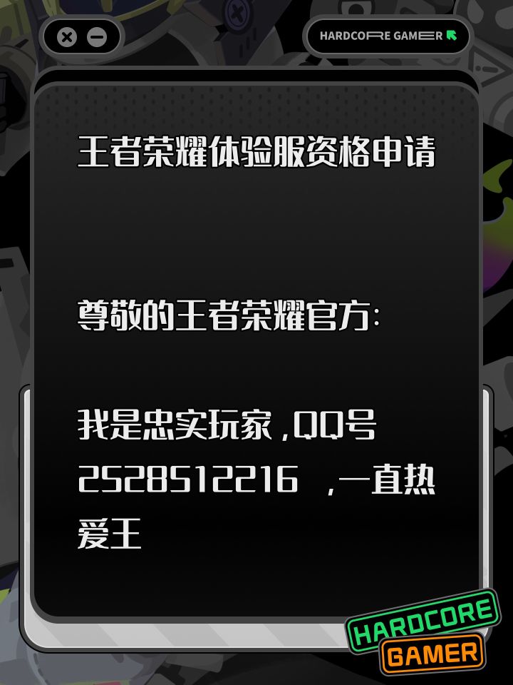 王者荣耀体验服资格申请 尊敬的王者荣耀官方: 我是忠实玩家,QQ号2528512216 ,一直热爱王者荣耀,渴望抢先体验新英雄和玩法,也愿积极反馈问题。希望能获得体验服资格,我定会遵守规则,认真参与测试。 盼复! 申请人潘龙#王者荣耀体验服 #王者荣耀体验服点券 #申请王者荣耀体验服资格资格申 #王者荣耀体验服资格申请根申请加入白名单申请加入白名单 #怎么进入王者荣耀体验服 #我怎么才能玩