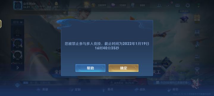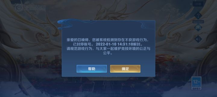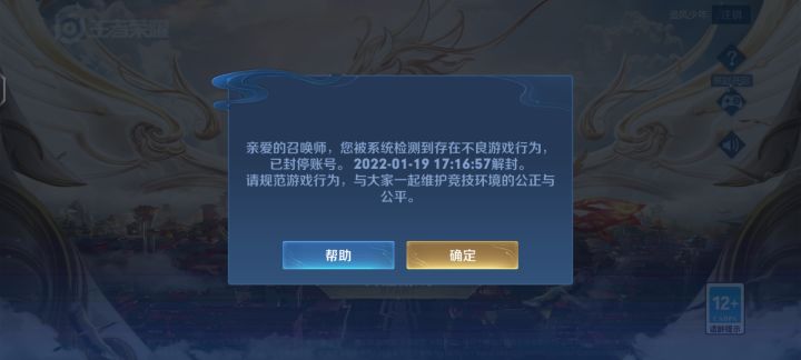我好不容易信任你一次你却莫名封了我号焯!(事情是这样的我好不容易搞到王者体验服账号,登进去我就领了一下邮箱里的等级奖励,然后我点开战令,结果莫名其妙就说我违规行为封我一小时,这还不过分,我号解封后赶紧登上去刚到主界面又莫名其妙给我封了什么意思没有任何游戏体验,第三次又封了)太好玩了这游戏😅😅😅😅