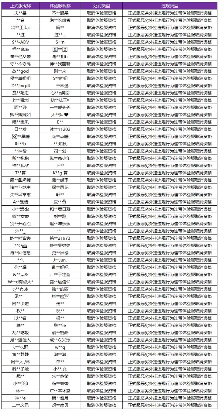 8月4日体验服违规处罚公告