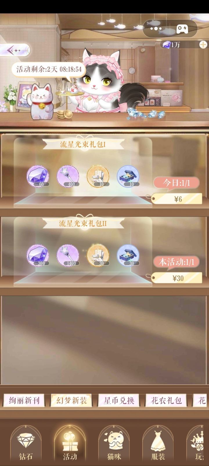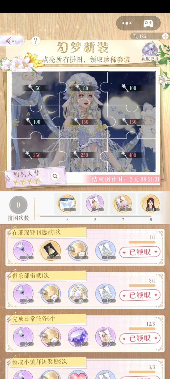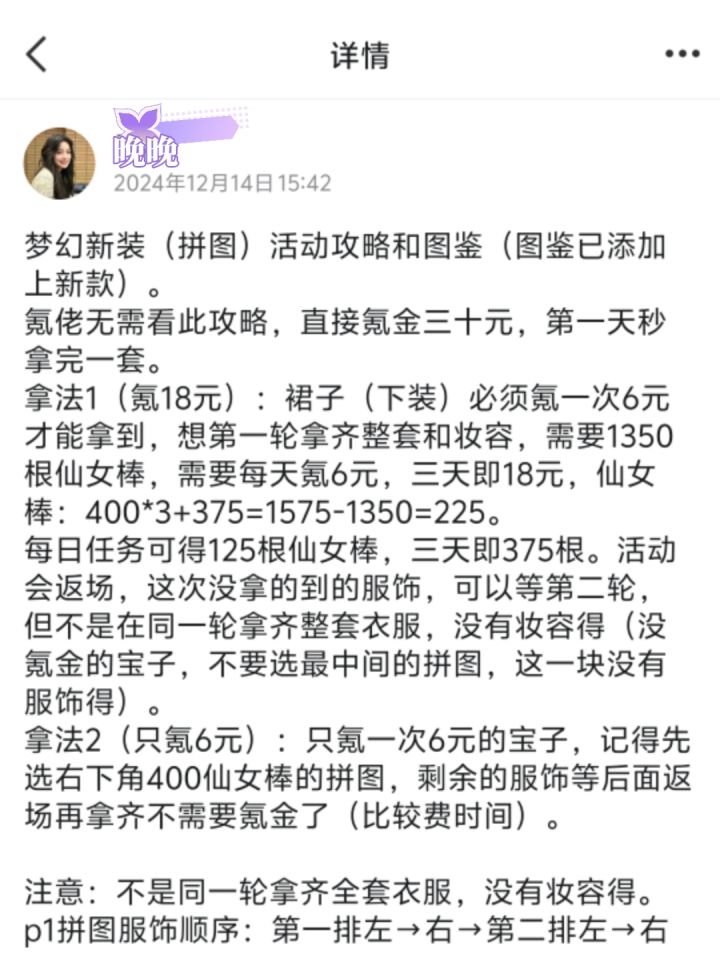 梦幻新装活动每期3天时间,不氪金拿不齐一套,必须一次性拿齐一套才能领到妆容。拿法1(18rmb):每天氪6元礼包(先兑400仙女棒那块拼图,先兑裙子/下装),氪3天,即18r,做满3天任务,即可拿满一套。拿法2(6rmb):只氪一次6元礼包,后面靠活动返场拿齐一套,此拿法拿不到妆容,但是可以拿齐一套衣服。拿法3(30rmb):氪一次30元礼包,秒拿齐