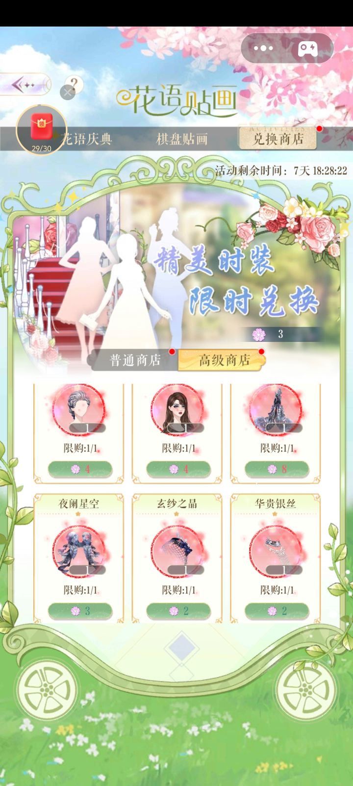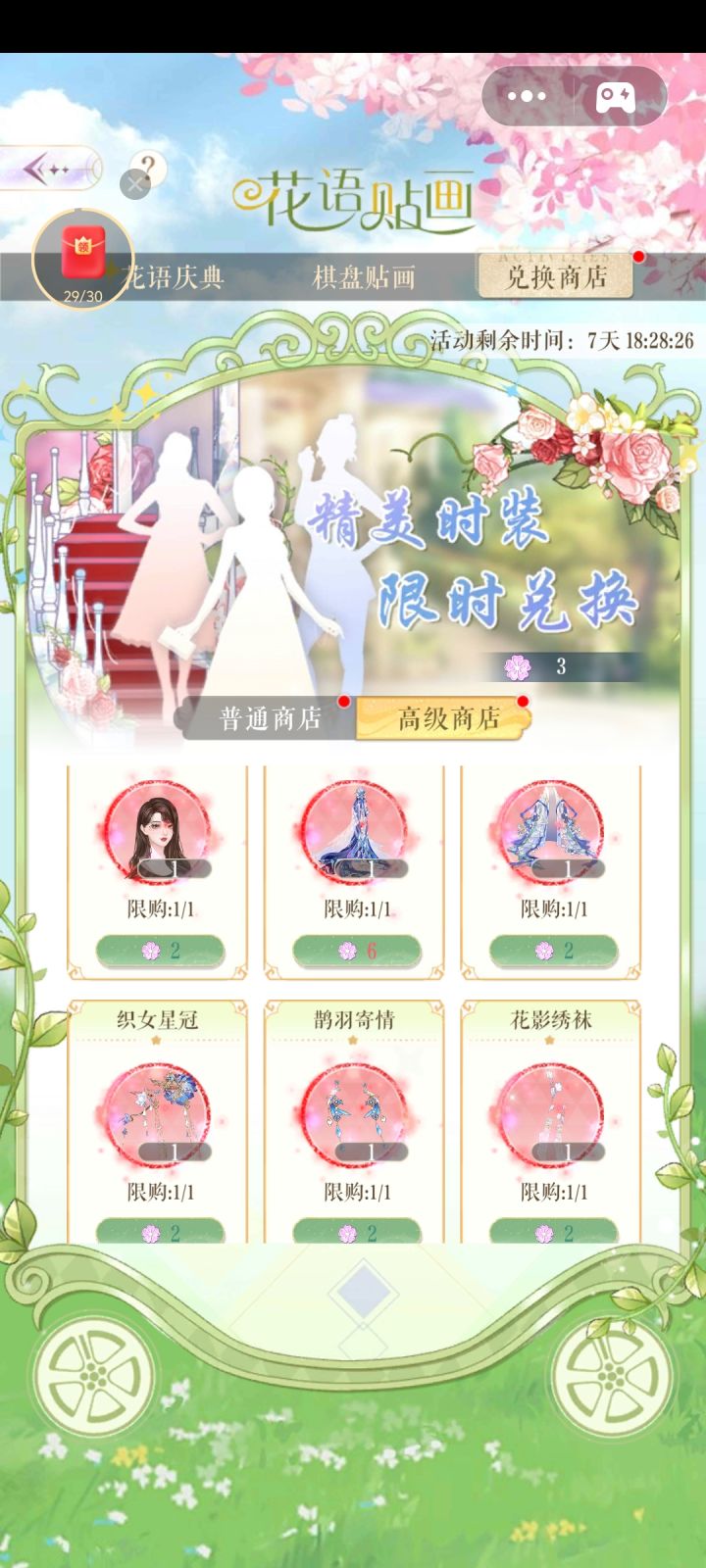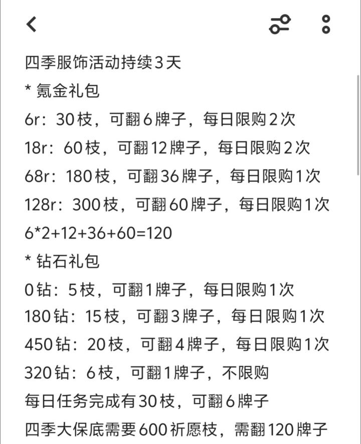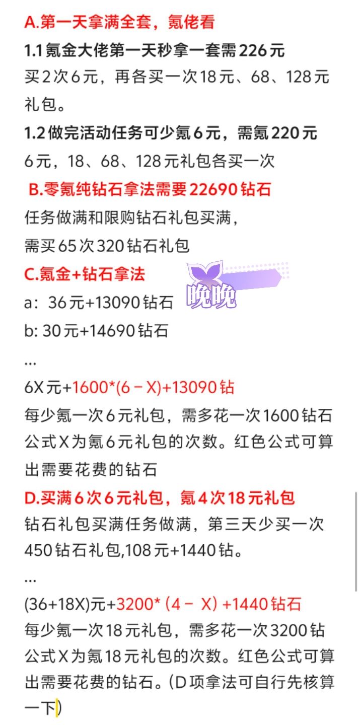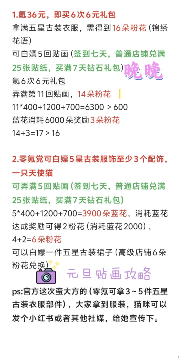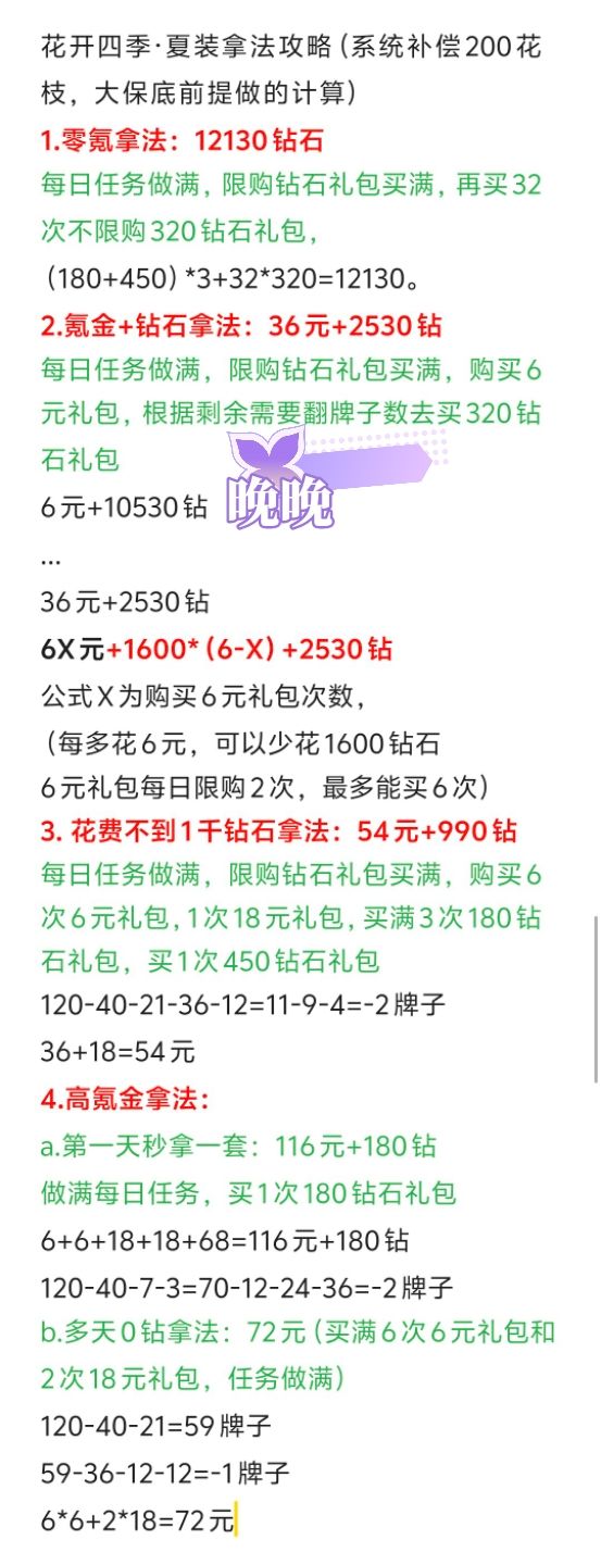 先划重点!!!🌟理智消费,谨慎购买。🌟开弓没有回头箭,一失足成千古恨。温馨提示:白嫖党想靠💎+日氪6拿下套装,基本地狱模式。♡♡♡ ♡♡♡ ♡♡♡ ♡♡♡ ♡♡♡🌟活动限时7天,我们算吃保底,一共是需要5×20×6=600🌸。日常给到13×7=91🌸每日氪6,7×20=140🌸超值购买①180×7=1260💎70🌸超值购买②450×7=3150💎112🌸共计:4410💎413🌸