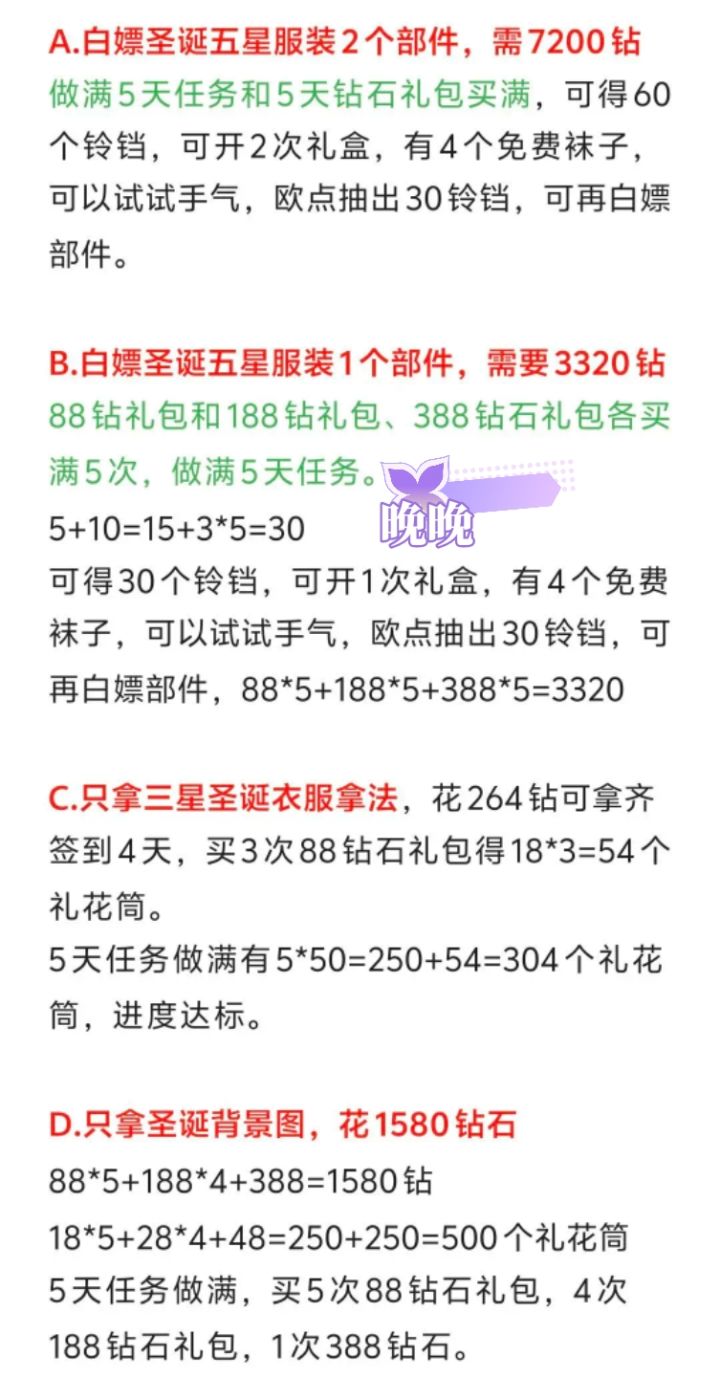 圣诞活动持续5天,图2是氪金拿法,极简版请看绿色和红色字。(一套衣服:48元+7200钻;两套衣服132元+7200钻石,按图2中拿法2,氪4次30元和2次6元。此攻略氪金礼包选袜子!!!)图3是零氪纯钻白嫖服饰部件等。#甜甜的你